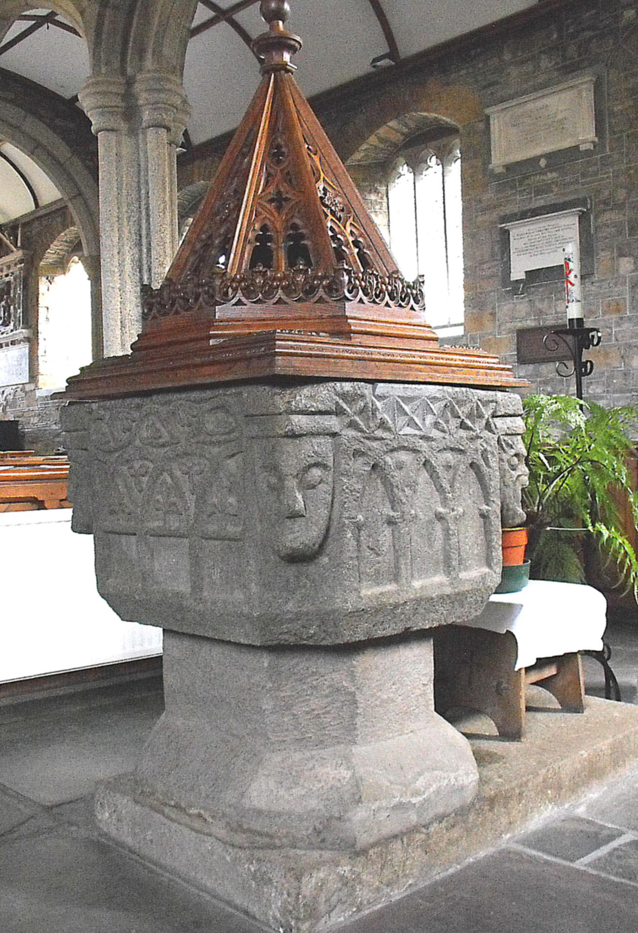 Notable furnishings in the church include the late twelfth century font mentioned above, with a square bowl featuring 'corner heads' at the angles (Pevsner's description in The Buildings of England: Devon, New Haven & London, Yale University Press, 2004, p. 536) and intersecting round arches beneath saltires on the sides. Mediaeval carpentry is limited to the ceiled barrel-vaulted roofs above the nave, aisle and chapel, which still have their narrow ribs and (in the case of the first and last) bosses exposed to view. Finally, two prominent sixteenth/seventeenth century monuments in the chancel include a large one to the north, commemorating William, Arthur and Lady Harris (d. 1590, 1618 and 1630 respectively), featuring three life-sized kneeling effigies separated by tall Ionic columns in black alabaster, showing William and Lady Harris clasping their hands in prayer while Sir William in the centre holds his right hand on his chest preparing to draw his sword with the other. ('Not good' was Pevsner's very fair assessment of its quality.) The wall monument opposite, of painted stone and alabaster, is dedicated to John Dynham (d. 1641) and his wife, Margaret (d. 1649), and comprises a half-digested classical surround featuring Corinthian columns supporting a pediment, triglyphs alternating with roses along the frieze, and the crudest of figures above - presumably two angels lying on the pediment and what looks like a naked St. Peter holding the keys to the gates of heaven, standing within.