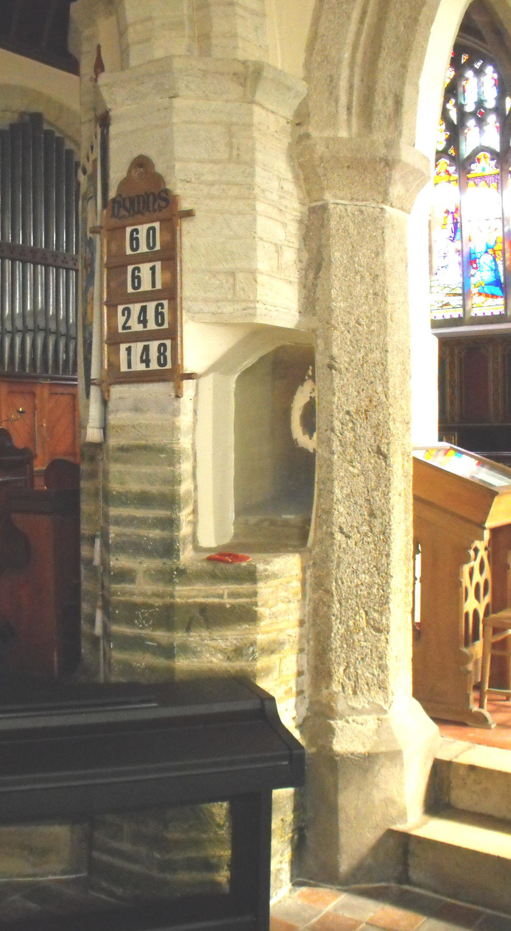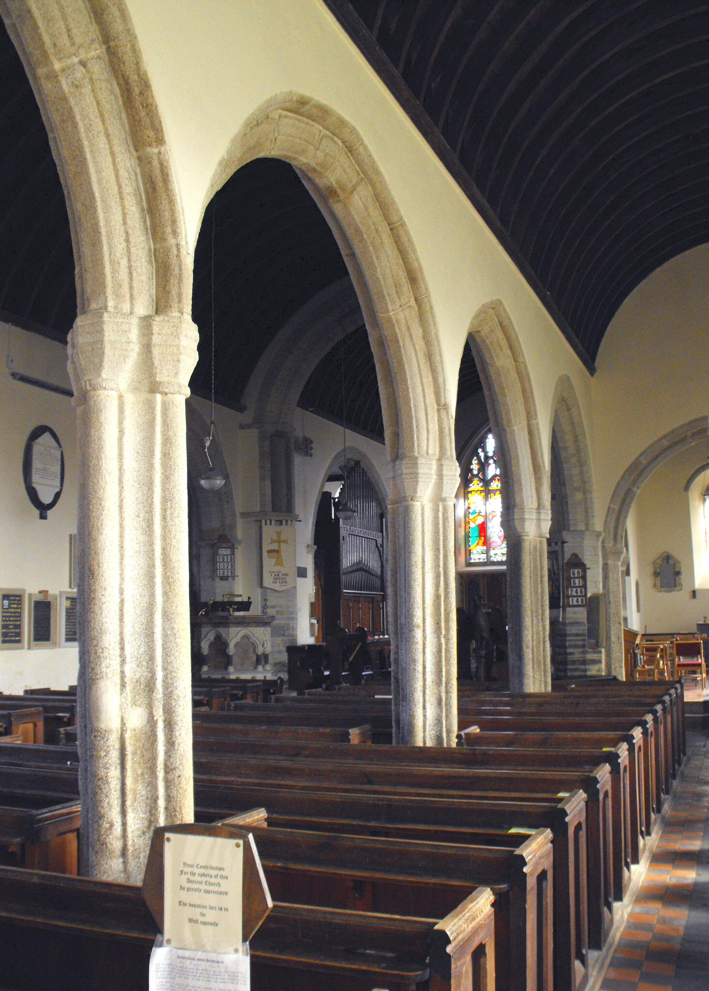 However, regardless of the precise sequence of events here, the rest of the S. arcade (i.e. the three western bays) - comprising arches carrying two wave mouldings, springing from piers composed of four shafts separated by hollows with capitals to the shafts only - adopts the standard late fifteenth or early sixteenth century form of, perhaps, a hundred or more church arcades in central and southern Devon, suggesting the granite pier sections and arch voussoirs were being mass produced during this period, at a central location. (See the photograph above right, taken from the southwest corner of the aisle.) The integral S. porch is a less usual feature deriving from a time of moderate prosperity that led to this spate of church building across the county. Its internal dimensions are striking since it occupies a space equivalent to one whole bay of the independently-gabled aisle, and it is also unusual in that inner doorway is set in the E. wall, thereby leading directly the west end of the aisle.