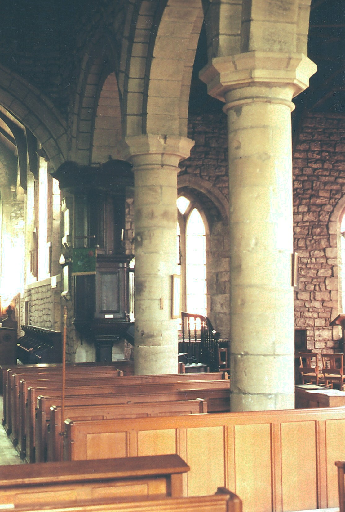 His one church, however, is a fine one, formed of a long chancel with a N. vestry and organ chamber, a short aisled nave with transepts and a S. porch, and a diagonally-buttressed W. tower. The church guide, written by Canon John Lee, rector from 1953-77, outlines a complicated history for the building which differs at a number of points from the history proffered by Pevsner in 1966 (in, it should be noted, the 'Yorkshire North Riding' volume of The Buildings of England (Harmondsworth, Penguin, pp. 311-312)), some of which cannot really be supported on purely stylistic grounds, but Canon Lee was probably justified in pointing out that the short wall pieces on either side of the chancel arch, extending westwards to the start of the three-bay nave arcades, are likely to be the remains of an earlier, Saxon building, even though the evidence of long-and-short work, to which he referred, appears distinctly tenuous. Yet the name of the village itself, of course, is enough to imply an important Saxon church was once situated here, and the position of the aisles - which are Norman in their essentials, whatever precise interpretations are placed upon them - set back from the chancel arch, does certasinly suggest that an earlier nave has been enlarged.
