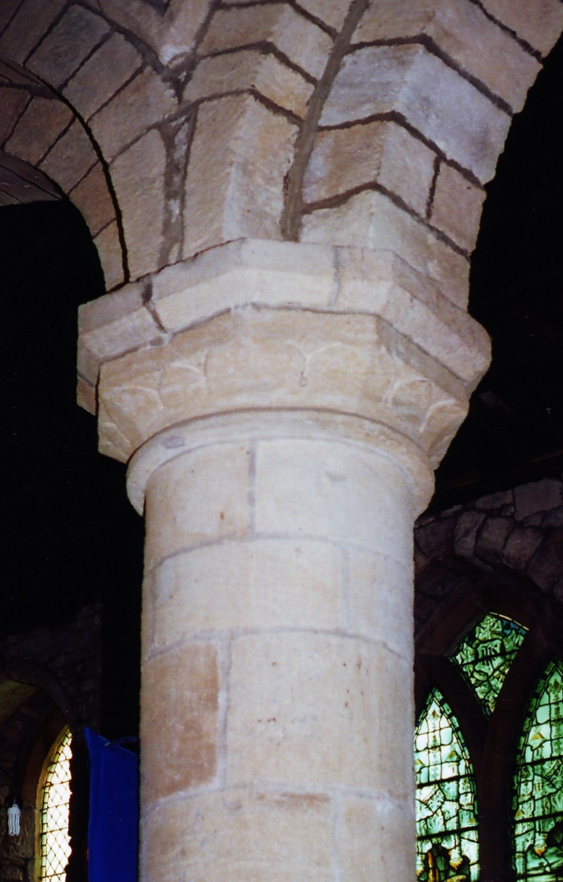 The arcades are composed of round arches formed of two unmoulded orders, supported on circular piers with modest capitals of varying designs. Pevsner described them both as 'late twelfth century' but Canon Lee said that 'the present north arcade and north aisle were built about 1155 [and] the south aisle and its arcade' (illustrated above left) were added 'roughly a hundred years later'. Yet both are essentially Norman-Transitional in character, and although some of the capitals on the N. side might, arguably, be considered cruder (see the example illustrated above right), the W. responds to both arcades, with keeled shafts supporting the inner order of the arches above, are almost identical to those to the nave arcades at Staindrop, some nine miles to the west, which are probably late twelfth century in date, and some of the arches at Romaldkirk appear to have been re-pointed at the very least, while any or all of the capitals could have been scraped or re-tooled.
