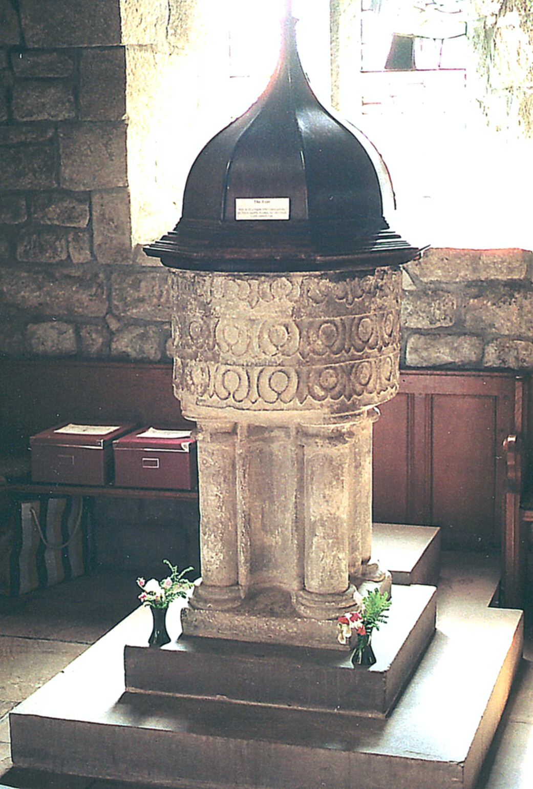 Finally, the font (shown left) presents another strange design, formed in this case of a circular bowl decorated with three tiers of horseshoes, supported on a stand with shafts at the angles and hollows in between. This again, could be Norman or Early English and, as with some of the other designs in this building, may also suggest that a mason working this far north in the uncertain times of the early Middle Ages, was frequently in only tenuous contact with artistic developments further south, and thus often thrown back on the products of his own imagination.