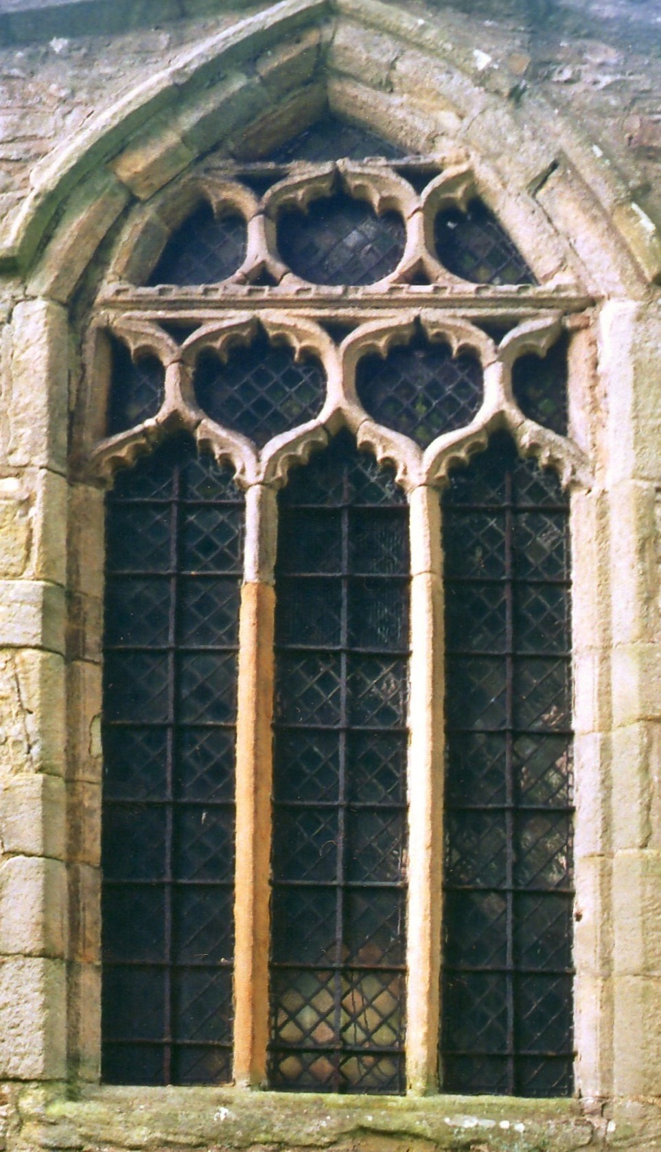 Pevsner dated the N. aisle and transept, on the basis of the more important of their windows, to the early fourteenth century, but Canon Lee ascribed the same windows to the fifteenth century, and while their tracery does appear, in essence, to be a variant of reticulated tracery, which would support Pevsner, the design is sufficiently odd, not to say inept, to render any dating speculative. In fact, of these windows, those in the N. transept E. wall and N. aisle W. wall are square-headed, with septfoil-cusped lights and a row of reticulation units above, each cinquefoil-cusped at the top but uncusped at the base (except insofar as it is unavoidably shaped to tessellate with the heads of the lights below). However, the two-centred N. window to the N. transept (shown above right) has two tiers of these reticulation units, one each above and below the springing, where they are separated by a castellated transom, which might be cited in support of Canon Lee. Perhaps the only conclusion that can be drawn is that whatever the date of this work, it cannot be judged a success, yet it is almost a monument to geometry when compared with the chancel E. window, where the tracery units are all utterly misshapen, and which was described by Pevsner as 'a perverse Perpendicular design of five lights… [that] looks like a protest against all rules'. Perhaps… Yet the incompetence of this design is of such staggering proportions, it is hard to believe that even the poorest of masons could have fashioned it, so perhaps there is a logical explanation for its form, the most plausible of which might be that it was constructed entirely from fragments (whether from here or elsewhere), in the sixteenth century or later.
