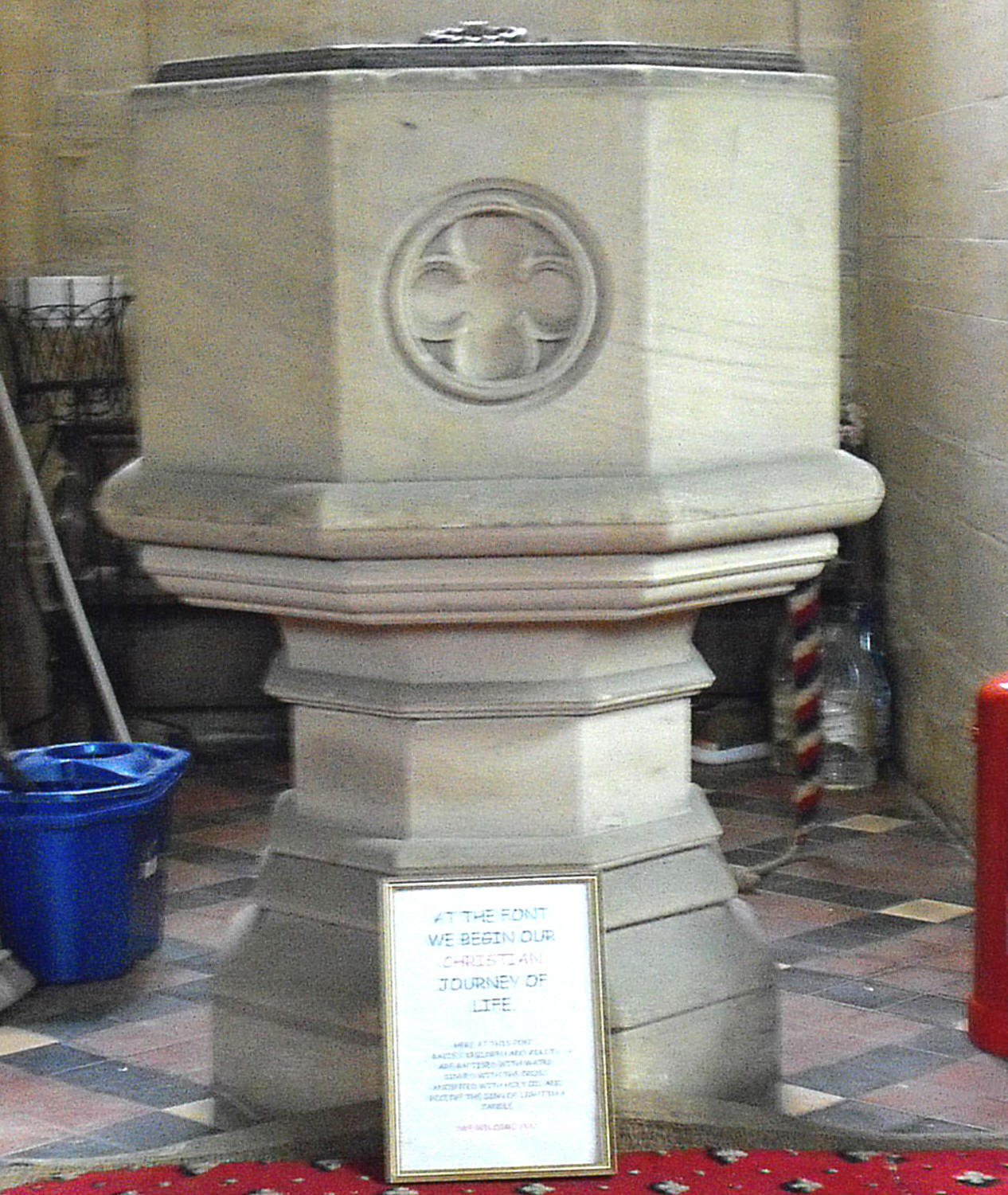 Internally, one of the most striking features of the building is the height of the tower arch in relation to its width. The font beneath (illustrated left) is by far the simplest in Street's churches for Sir Tatton Sykes, consisting of a plain octagonal bowl decorated only with recessed quatrefoils in circles in the cardinal directions, supported on a moulded octagonal base. The nave windows are set in deep rere-arches with sunk quadrant mouldings above. The stone pulpit in the southeast corner of the nave has open tracery in two tiers, made up of trefoil-cusped arches below and quatrefoils in circles above. The nave roof is arched to the collars, with further arched braces supporting the purlins at the ⅓ and ⅔ positions.