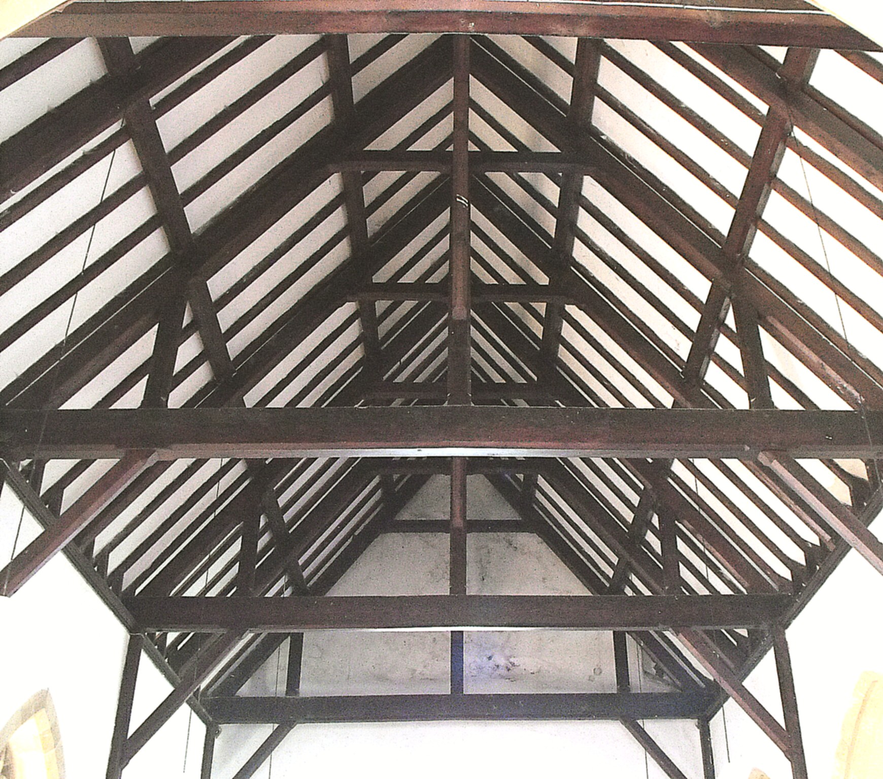 The church does not contain any significant furnishings and the Victorian stained glass it is supposed once to have possessed was destroyed by enemy action in 1940, which confines any further interest in the interior to the roofs: the chancel roof is relatively commonplace with scissor-bracing and purlins ⅓ and ⅔ of the way up the pitch, but the 'boxy' nave roof (shown below) is surprisingly elaborate. This too has purlins at the ⅓ and ⅔ stages, but these are now linked across the church by braced tie beams and collars respectively, and joined longitudinally and vertically by a collar purlin, octagonal king posts rising from the tie beams to the collars, and queen posts rising from the tie beams to the collar/ purlin junctions. It looks, perhaps, unnecessarily complicated, but it cannot be denied that the effect is quite striking.