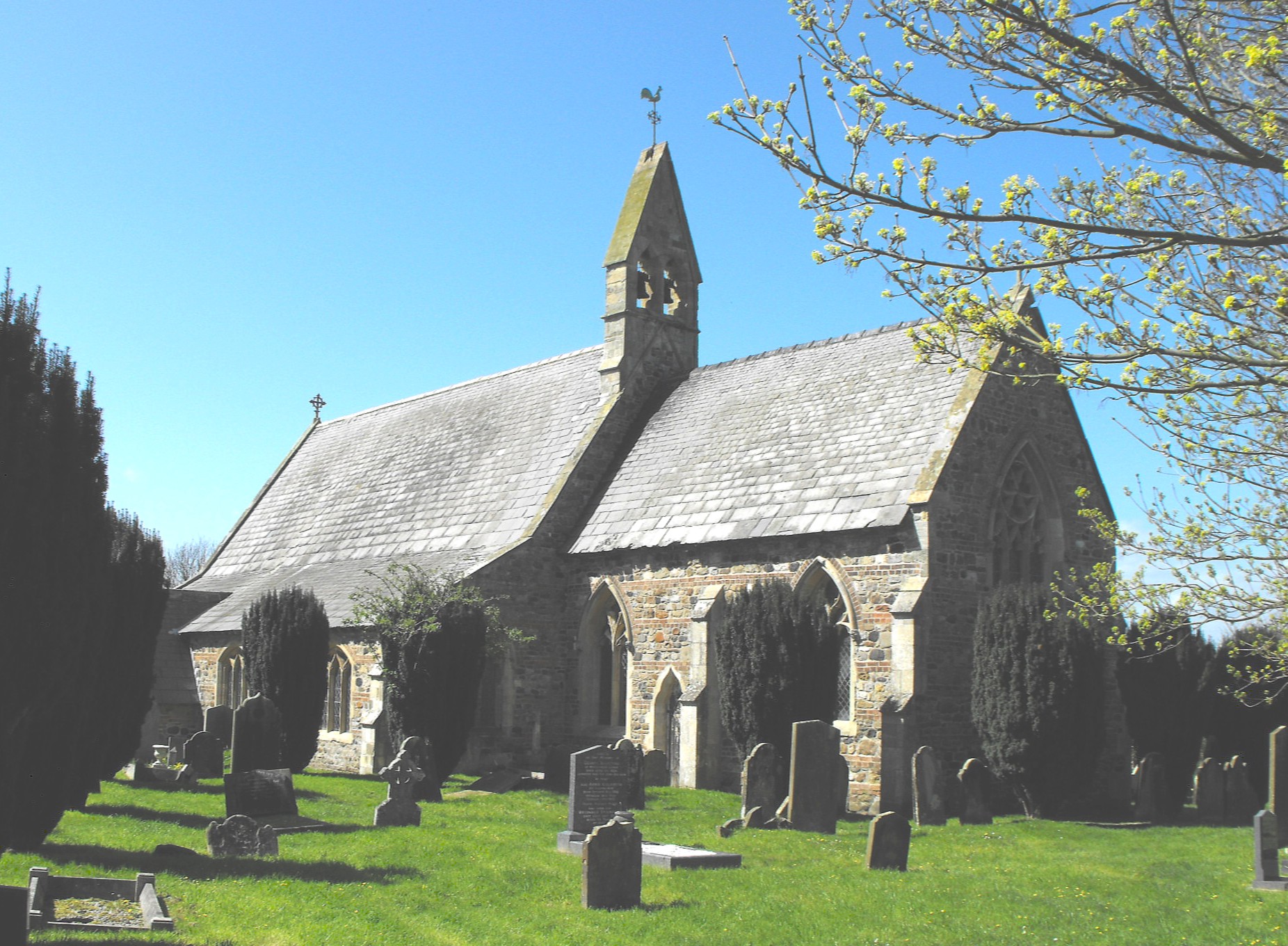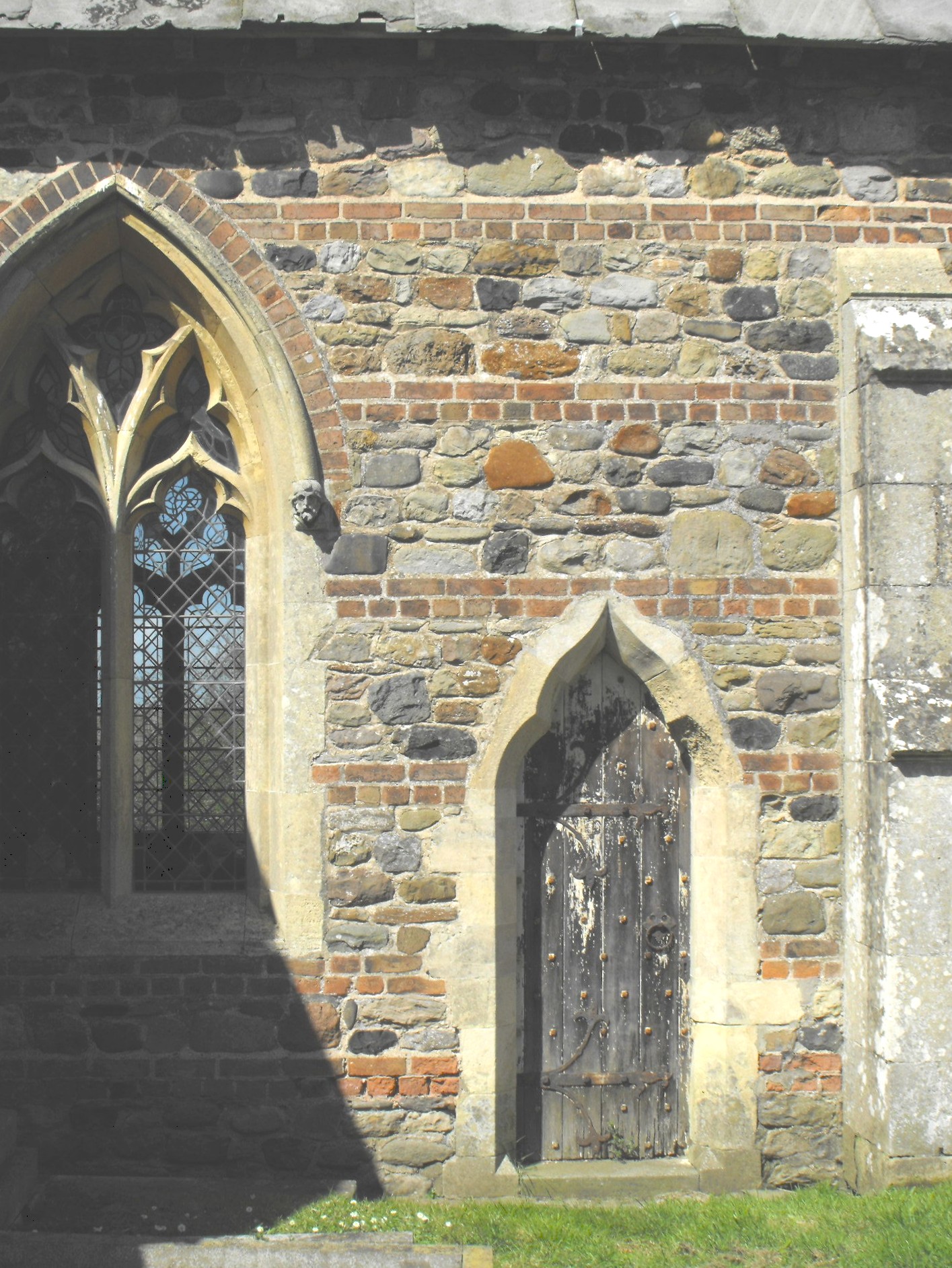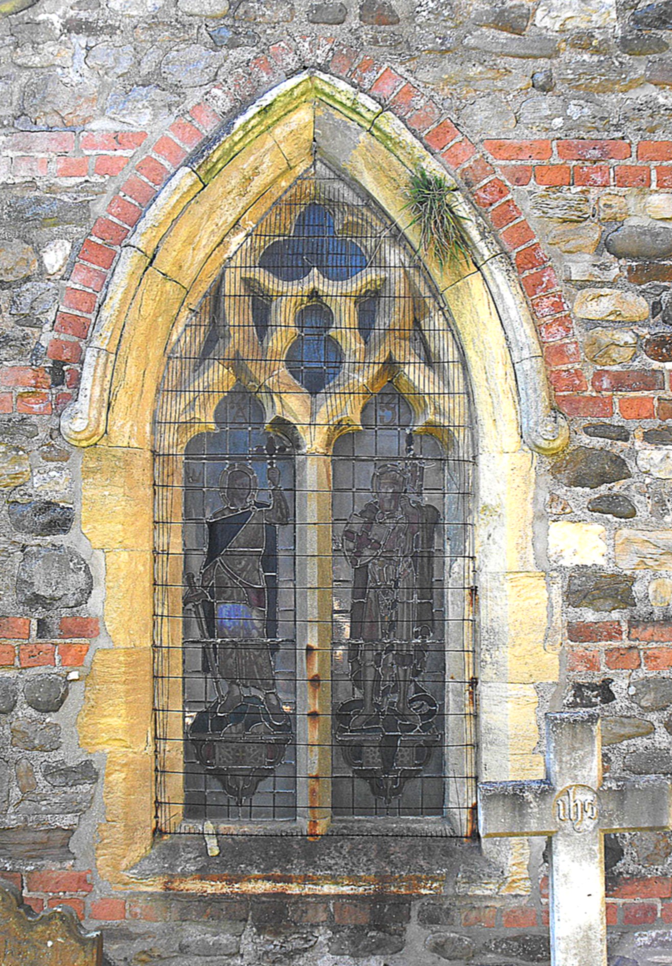 This little church (shown above from the southeast) was constructed by Mallinson and Healey on the site of an earlier building in 1854-5. Consisting of just a chancel, and a nave with a lean-to S. aisle, N. vestry, S. porch and E. bell-cote, it is distinguished by its attractive masonry, composed of large assorted cobbles laid in seven discrete bands separated by double courses of red brick, cream-coloured limestone dressings and roofs of grey slate, in one of Thomas Healey's very rare ventures into structural polychromy. (See the photograph below left, showing part of the chancel S. wall.) Windows adopt the flowing or curvilinear style and include one on each side of the chancel with falchion tracery and another with cusped Y-tracery with trilobes in the heads of the lights and daggers in the forks of the 'Y's. The aisle and vestry E. windows have an odd tracery featuring a trilobe above a bifoil (shown below right), which was probably a quirky design devised for a narrow window by Thomas Healey, for bifoils are encountered elsewhere in his work from time to time (as, for example, at neighbouring Mappleton), but the nave N. windows are reticulated and the aisle S. windows are untraceried and segmental-pointed. The tower W. window and chancel E. window are three-light and display, in the former case, trilobes above the outer lights and a wheel of quatrefoils in the head, and in the latter, outer lights subarcuated above daggers and a wheel of three trilobes above and between.