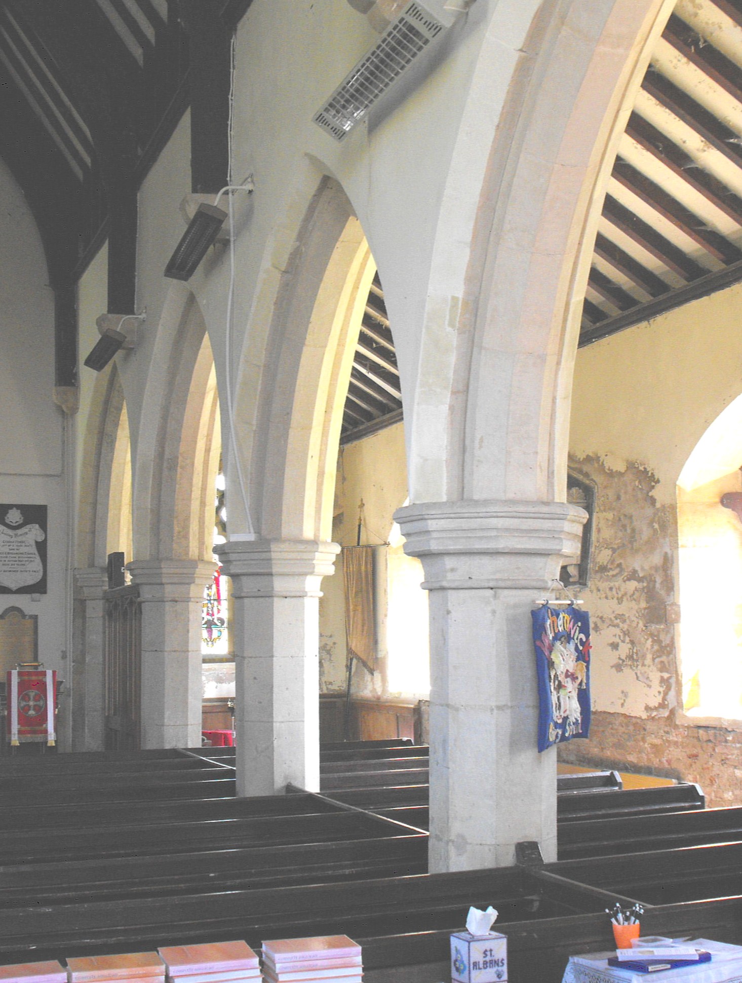 Inside the church, the five-bay nave arcade (below left) is composed of double-flat-chamfered arches springing from octagonal piers with prominent capitals and an astragal beneath - a very basic form that nevertheless suggests the early fourteenth century. The majority of this work appears to have been re-used but the westernmost pier is a replacement along as are various blocks of stone elsewhere. The double-flat-chamfered chancel arch rests on semi-octagonal responds and the doorway from the chancel to the vestry is trefoil-cusped and ogee-pointed.