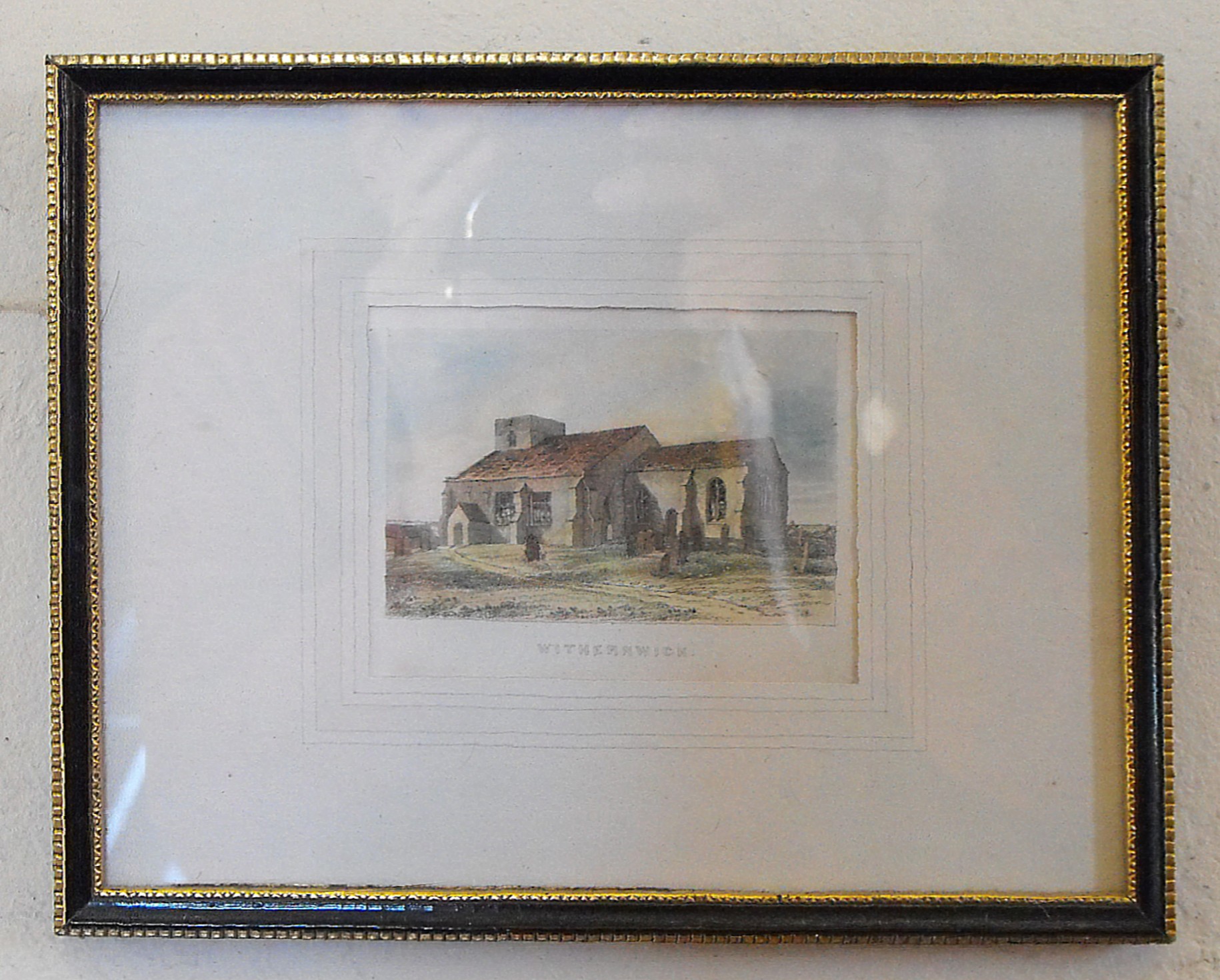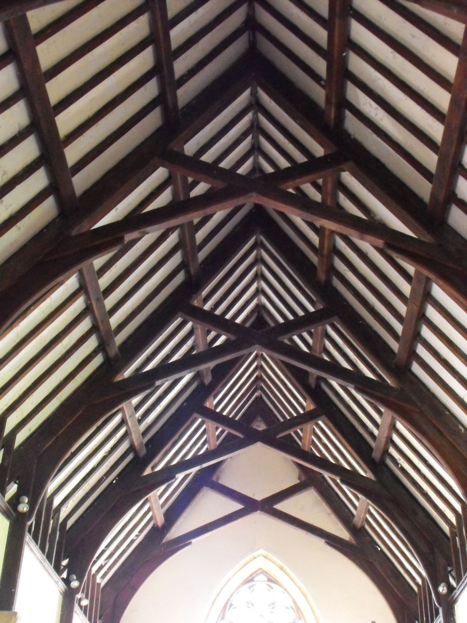 Interesting carpentry in the building is confined to the nave and chancel roofs, both of which are scissor-braced but where the narrower scantlings and absence of purlins in the chancel roof (compared with purlins ⅓ and ⅔ of the way up the pitch in the nave) produce a more delicate effect. (The photograph above right shows the nave roof looking west.) The wooden furniture all seems to be twentieth century in date but the church contains a few re-set eighteenth and nineteenth century wall monuments, including three commemorating the Rev. Matthew Topham (d. 1773) and his sons. More interesting than these however is the drawing showing the church prior to reconstruction (as seen below). It is evident at once there was very little work suitable for re-use.