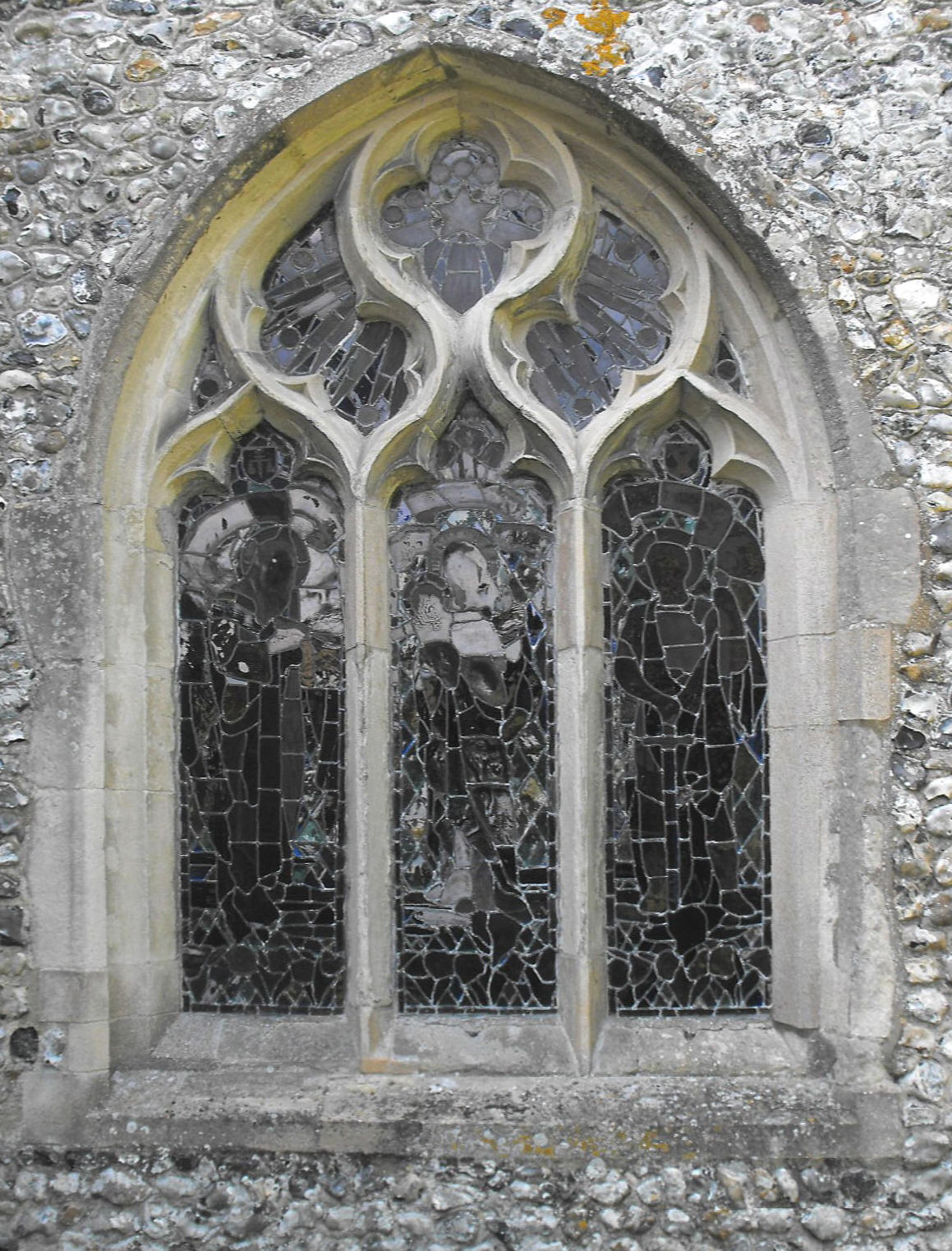 This is quite a large church but one so substantially restored and rebuilt that its architectural interest is now confined to a number of individual features. The building consists of a chancel, an aisled nave with a S. porch, and a W. tower with a prominent semi-polygonal stair turret at the southeast angle, and externally, almost its only surviving mediaeval features appear to be two, possibly re-set, Decorated windows towards the east end of the N. aisle - a two-light one to the north and a three-light one to the east, the latter with ungainly tracery composed of a quatrefoil and two over-large mouchettes above trefoil-cusped ogee lights (illustrated below left). The tower and nave clerestory were entirely rebuilt in 1855 (notes in the church) but the porch is essentially mediaeval and Perpendicular: its outer doorway carries wave mouldings and hollows beneath an ogee-pointed dripstone and a stone panel carved with two shields and a cross, while the inner doorway carries two flat chamfers above two orders of semi-octagonal shafts. The material in all parts of the building is flint and pebble rubble with dressings, according to Pevsner, of imported Caen stone (Nikolaus Pevsner & James Bettley, The Buildings of England: Essex, New Haven & London, Yale University Press, 2007, p. 90).
