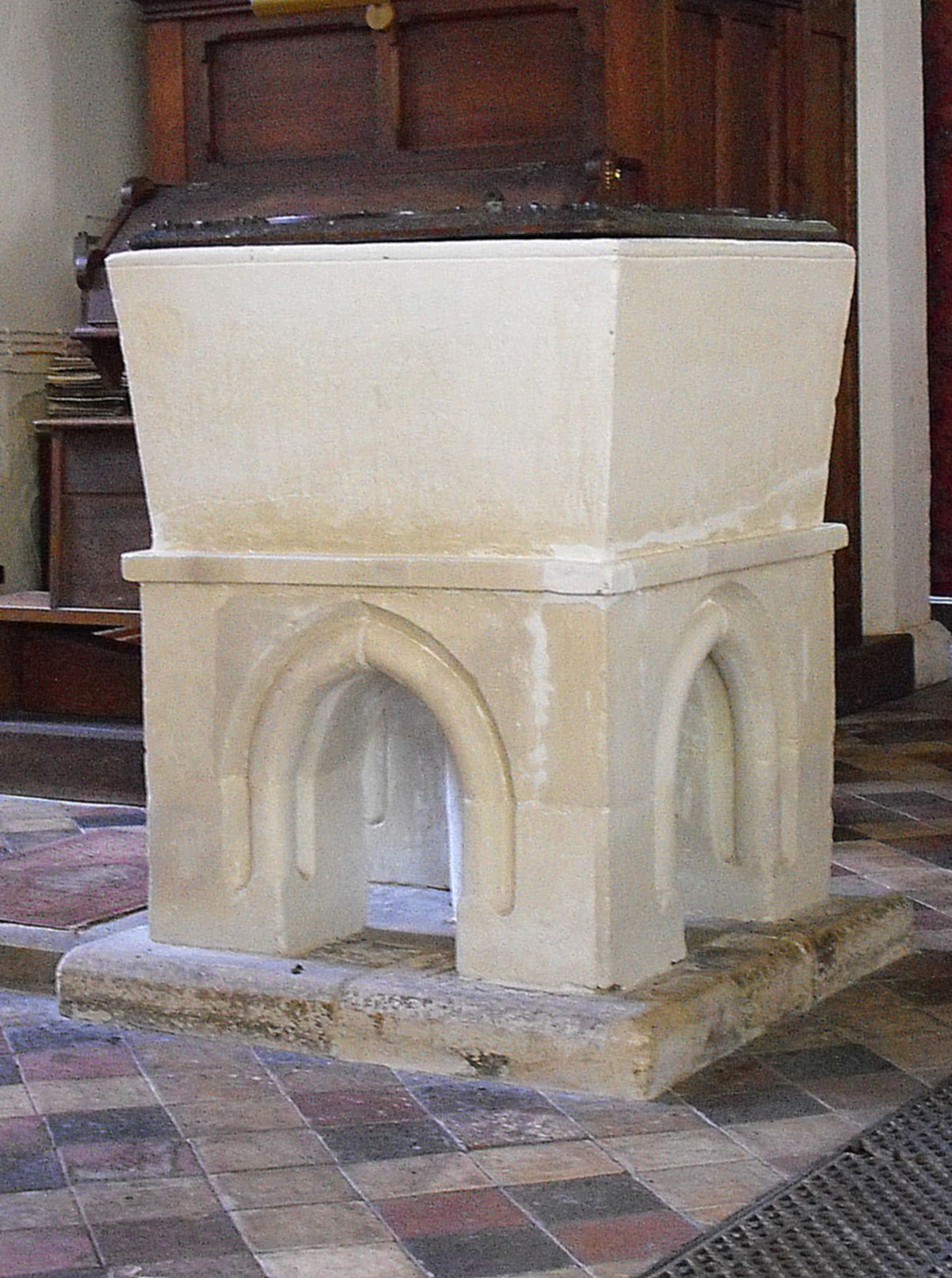 Inside the church, the differing pier sections of the arcades presumably have some mediaeval basis (both arcades are double-flat-chamfered but the S. arcade is supported on round piers and the N. arcade on octagonal ones, as seen in the interior photograph looking east, above right) but it would be rash to assign a date to either as the capitals appear to have been retooled or renewed. The chancel arch is unashamedly Victorian and formed of an arch of complex profile springing from semi-octagonal responds with deeply-cut leaf capitals. The font (below left) is another uncertain masonry feature however, comprising a square cambered bowl resting on a base cut through on each side by a lancet opening surrounded by a roll moulding. Pevsner suggested the bowl might be twelfth century work and the stand, thirteenth century, but if so, then both appear to have been scraped or tidied up in some way. The chancel and nave roofs of hammerbeam construction are Victorian but in the nave, at least one of the original head corbels beneath the wall posts has been preserved.