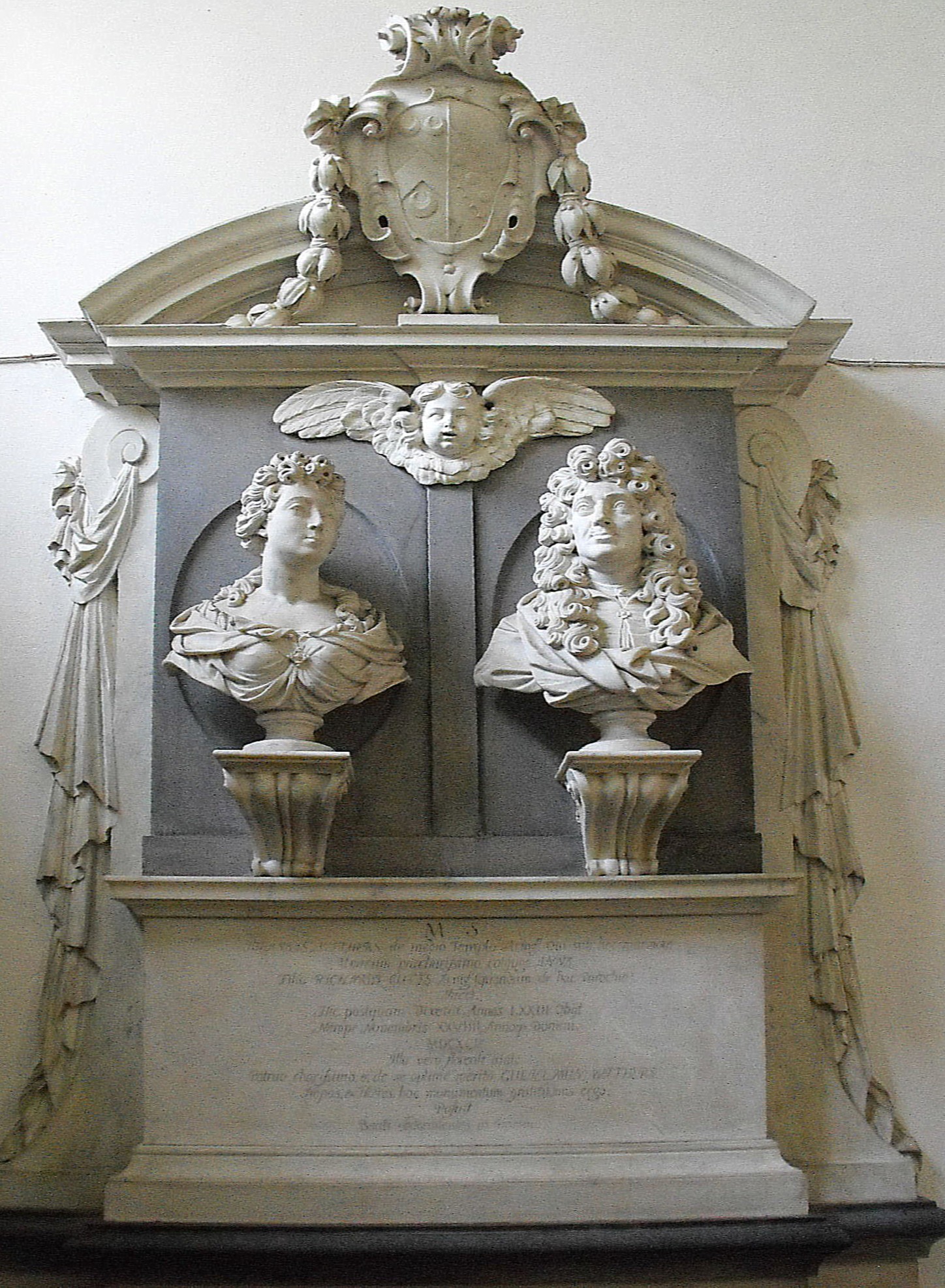 Finally, described, entirely fairly, by Pevsner as 'a first-class work', there is an archetypal late Stuart wall monument against the N. wall of the tower (the upper part of which is shown above right), commemorating John Withers (d. 1692) and his wife, featuring skulls and branches in bass relief on the tomb chest below, and on the upper part above the inscription, excellent busts of the couple dressed in their best clothes, he bewigged, and with drapes at the sides, a disembodied winged cherub hovering above, and in the open pediment at the top, a huge achievement reminding the viewer of their distinguished genealogy. This is the work of Edward Pearce, who Rupert Gunnis recorded as having had 'a high reputation among his contemporaries' (Dictionary of British Sculptors, 1660-1851, London, The Abbey Library. 1951, p. 297). Pearce was employed at various times in his career at St. Paul's Cathedral, Hampton Court and Whitehall, but this must have been one of his last commissions for he died in 1695.