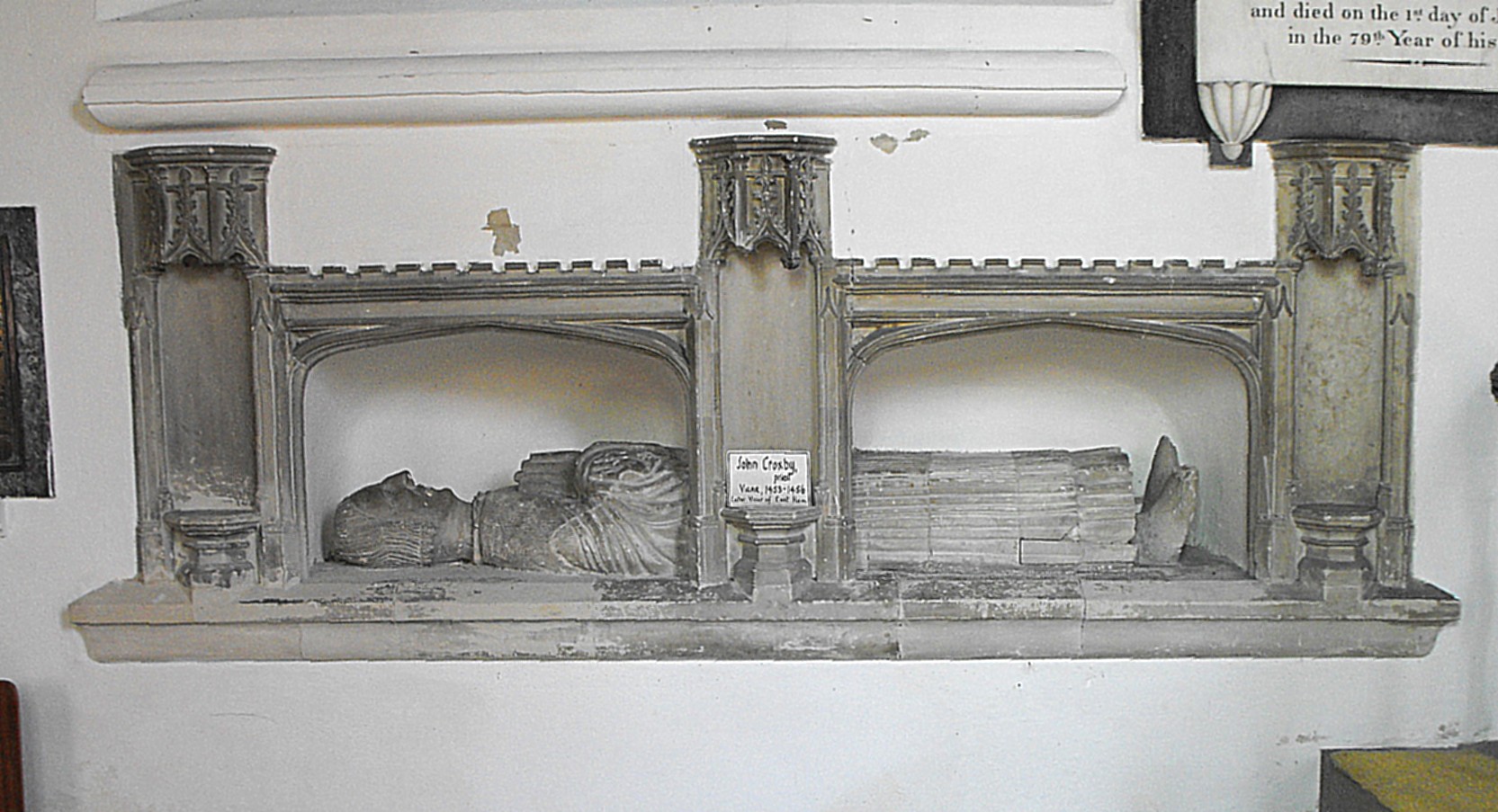 That brings the visitor to the monuments, which are the most significant items here, beginning in age order with a fifteenth century tomb chest recessed in the N. wall of the chancel (as seen below), bearing a recumbent effigy bisected by a slab of masonry halfway along, like a stunt-woman at a circus about to be 'sawn in half'. Commemorating John Croxby, who was vicar here from 1453-56 (or 1435-56 - the inscription beneath and the notes in the church are contradictory), it features crocketed gabled niches at the ends and mid-point that leave the effigy visible through two very depressed four-centred arches beneath an embattled cornice. More striking than this, however, is the enormous painted Tudor tomb chest at the E. end of the S. aisle, with the recumbent effigies of Richard Cutte (d. 1592) and his wife laying on top, their hands clasped in prayer, beneath a heavy canopy supported on six balusters. The couple's six children kneel around the chest but only the two girls have escaped decapitation.