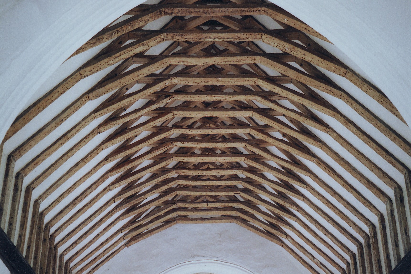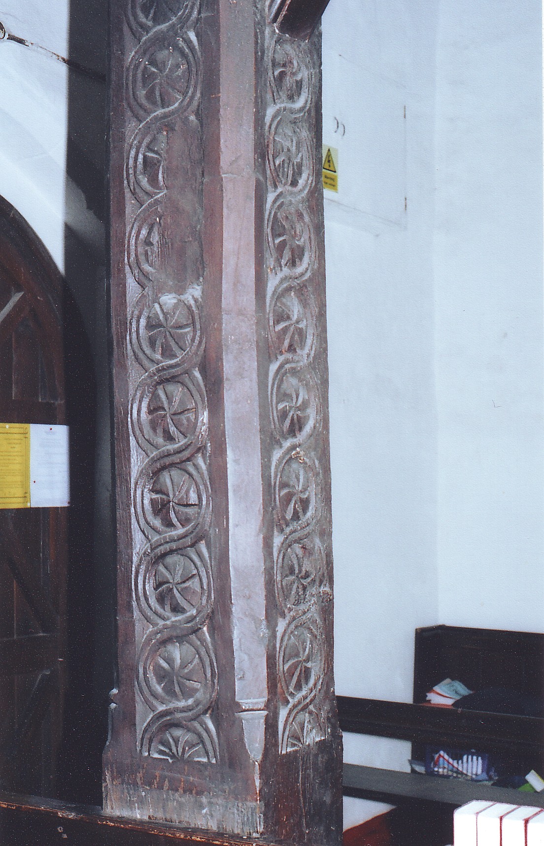 This is humble stuff but nside the church, it is the carpentry that is most interesting and Hewett must be quoted for his description of the nave and chancel roofs and belfry. 'The chancel roof [illustrated below] is ... of seven cants with scissor braces made of tenoned short lengths; these are a type derived from Salisbury cathedral's northeast transept, dated to c.1237. The nave roof is also of seven cants and there is a belfry at the W. end, originally on portal frames. It is now carried by four eastern posts, the central pair of which are due to a seventeenth century repair,... carved with guilloche ornament [as seen above right and at the foot of the page]' (Church Carpentry, London & Chichester, Phillimore, 1982, p. 97). The posts support plaster arches, which divide off the westernmost bay of the nave, to create a wide vestibule. Externally, the belfry has been rendered and made ridiculous by the addition of plaster battlements.