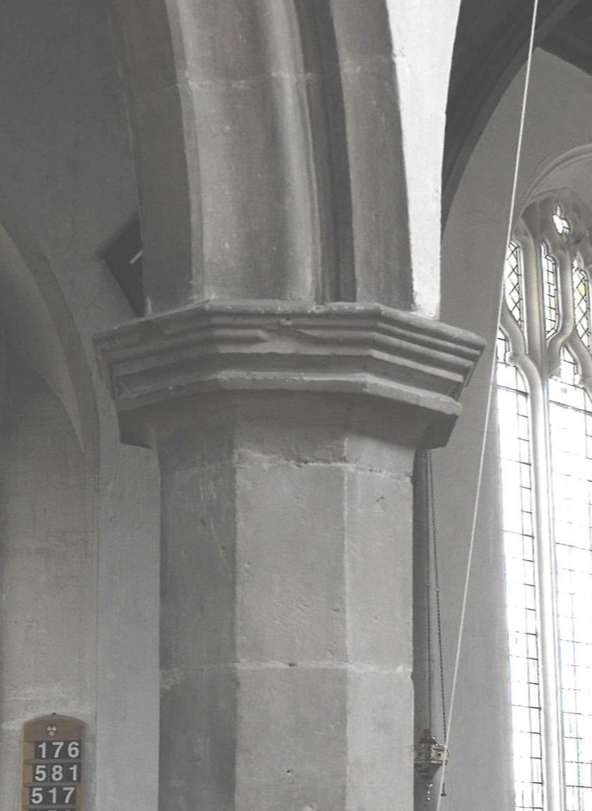 Nevertheless, what is certain is that the two western bays of both arcades are later, for here the arches bear wave mouldings and the piers have shafts towards the openings only and are unmoulded to the north and south, producing a design which is similar to that at St. Peter’s church, half a mile to the west, where a date of c. 1450 has been proposed. (See the photograph above, showing an internal view of the nave, looking west.) The chancel arch and the arches between the aisles and chapels are different again: these too are Perpendicular but now they have become as slender as it is possible to be - indeed, too slender to look satisfactory. Yet that does little to impair the internal appearance of the church overall, due, in particular, to the impressive chapels themselves.