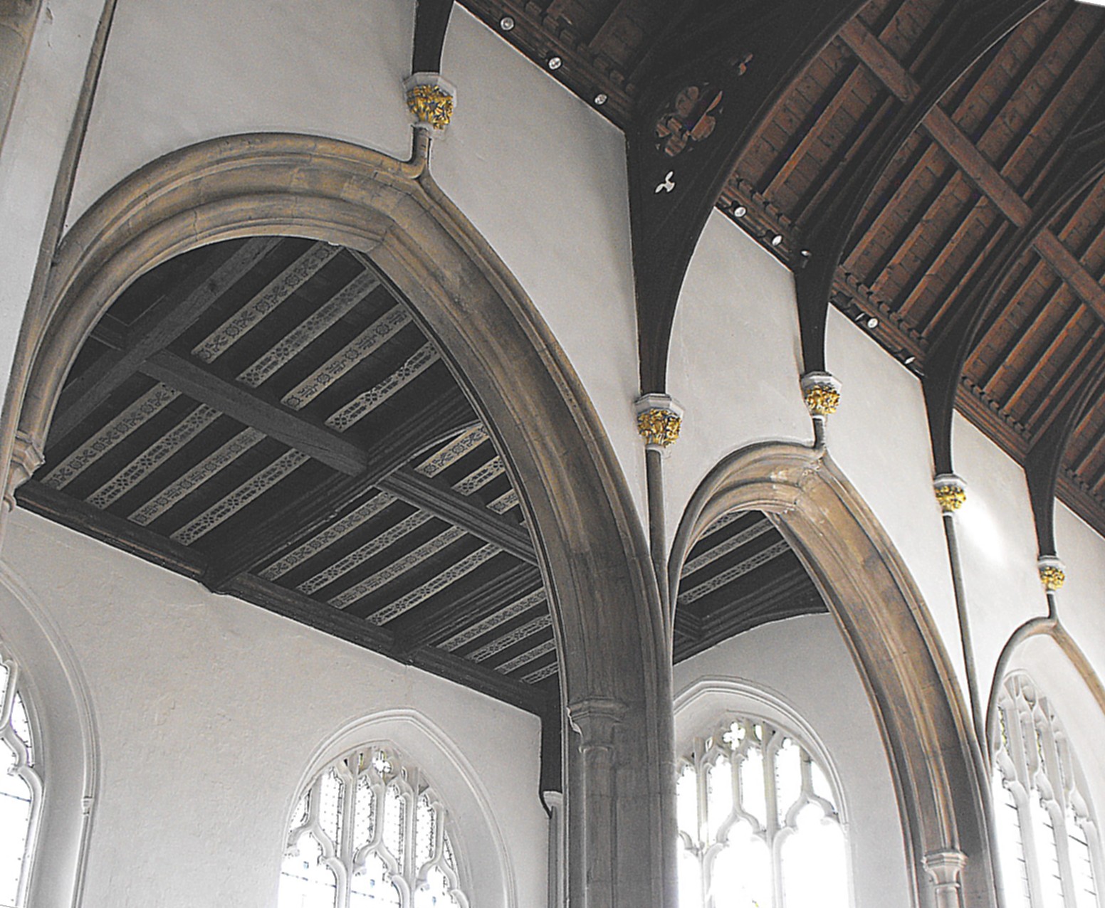 Here the affinities are entirely with St. Mary’s, Dedham, although not with Dedham alone, for the two-bay arcades between the chapels and chancel (illustrated below left) not only copy the design of the nave arcades there (albeit that the Dedham arches are four-centred rather than two-centred), but also the nave arcades at Stratford St. Mary, just over the county border in Suffolk, and - going backwards a little in time - the nave arcades at St. Mary's, Martham, Norfolk, and Blackfriars' church (now St. Andrew's Hall), Norwich, where the mason was considered by Birkin Haward to have been Robert Everard (fl. 1440-85), master mason at Norwich Cathedral from c. 1452 (Suffolk Mediaeval Church Arcades, Hitcham, Suffolk Institute of Archaeology and History, 1993, p. 387). Everard had an assistant by the name of John Antell, who appears to have died in the same year as his master but who may briefly have inherited the use of Everard's moulds, enabling him to pass them on to other masons in his family. The most important of these was Robert Antell, who was probably a son or grandson, and if these deductions are correct, then Robert Antell might have been the master mason of the chancel chapels here. Haward suggested a date for the work of c. 1500 and thought the chapel roofs were probably contemporary.