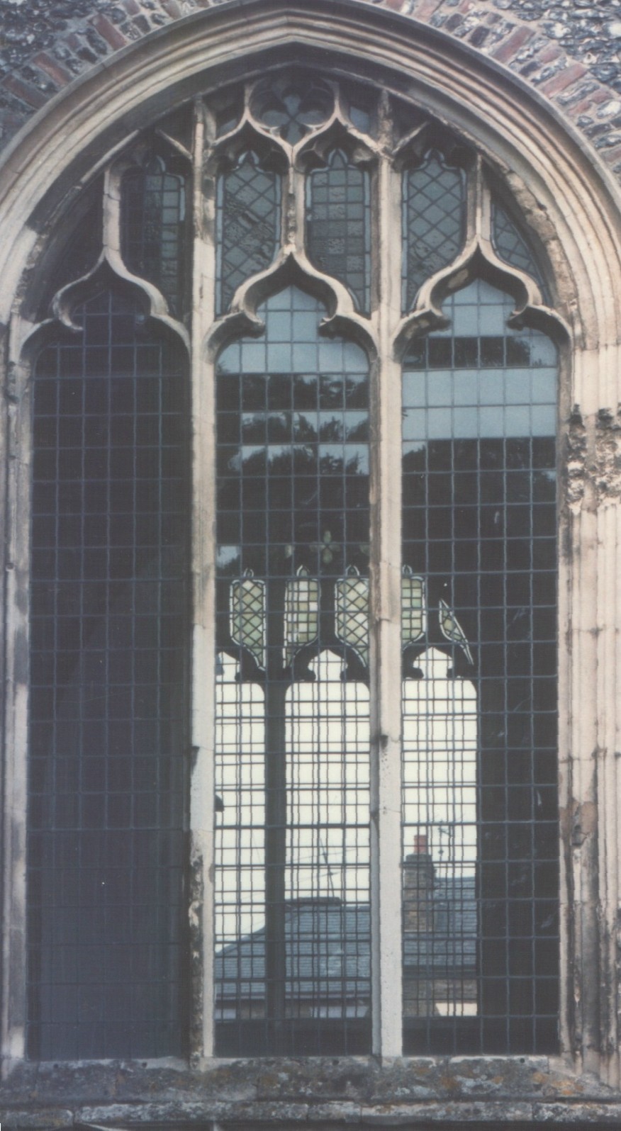 The aisles and porch have had their exterior detail renewed but the chapels are largely original and faced with flint above basal flushwork friezes. The great three-light windows (or four-light in the case of the S. chapel E. window) are almost identical to Dedham’s aisle windows, of which more later, and feature supermullioned tracery with trefoiled, ogee-pointed lights and sublights, strong mullions, and quatrefoil oculi. (See the photograph right, illustrating a S. chapel S. window.) The restored five-light E. window to the chancel has a quatrefoil in the oculus and outer lights subarcuated in pairs.