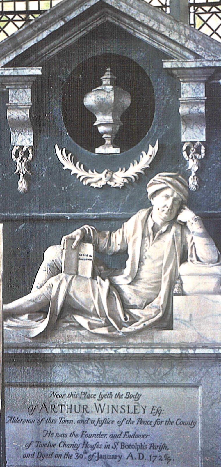 Finally and, perhaps, surprisingly, the church contains no memorable furnishings and only one important monument, albeit one by the great early eighteenth century statuary, John Michael Rysbrack (1694 - 1770). (See the photograph above right.) Unmentioned by Gunnis in his Dictionary of British Sculptors, it seems to have been identified first in Michael Craske's groundbreaking study, The Silent Rhetoric of the Body (New Haven & London, Yale University Press, 2007, p. 375), but it is a fine piece of work in grey and white marble, commemorating a local benefactor, Arthur Winsley (d. 1727), who died without heirs and donated his entire fortune to the foundation of twelve charity houses in Colchester, save only for £200 which he left to his executors to pay for this monument. Depicted according to his own specification, reclining on his left hand and holding a book in his right hand, he requested that its inscription should be 'as my most judicious friends think proper' (Craske). Consequently, as he would probably have wished, it is suitably matter-of-fact, and only the book bears anything resembling a eulogy, encapsulated in the legend, 'Go thou and do likewise'.