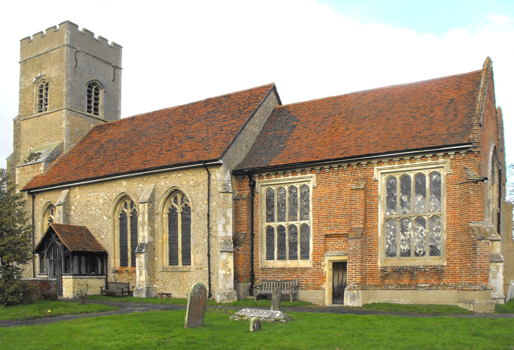 This interesting church is essentially the product of four periods of construction during the fifteenth, mid sixteenth and early eighteenth centuries. The first, around the 1430s, was responsible for the present nave and chancel E. window, although at the time, the former late Norman church on this site was completely rebuilt at the expense of the Thomas Rolf. Serjeant-at-Law (d. 1440), whose brass lays the tomb chest south of the altar (notes in the church). It is thought it was his daughter, Editta, who subsequently paid for the erection of the W. tower c. 1490 in order to bring her father’s project to a completion. However, seventy years after that, Rolf’s great-great grandson, Sir John Wentworth, who had just overseen the raising of Gosfield Hall, commissioned the building here of the large N. chapel in English-bonded brick, with a vault below, for the future burial of himself and his family, and this so unbalanced the aspect of the church from the east that it was then considered necessary to both heighten the chancel and widen it towards the south. Lastly, in the 1730s, the widow of John Knight M.P., later Countess Nugent, paid for a square brick room enclosing a family pew to be constructed against the W. end of the chapel, from which it is approached up six steps. This contains a large and very fine monument by the eminent sculptor John Michael Rysbrack (1694 - 1770), which is now the church's most important feature. The work deriving from these four building phases will now be described in turn.
