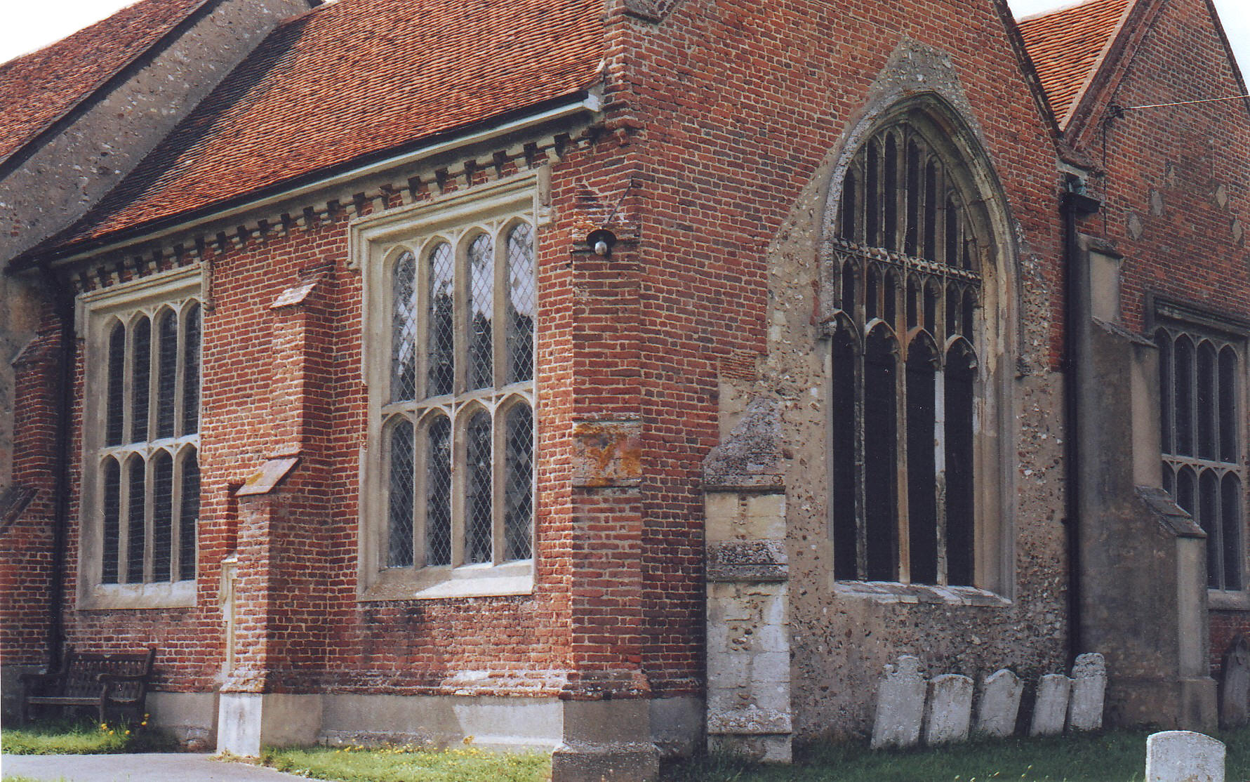 The independently-gabled N. chapel is lit to the north and east by three large, four-light, square-headed windows, which are transomed but uncusped. The S. windows to the chancel, which was extended in brick, were replaced at the same time (see the photograph above, showing the chancel and N. chapel from the southeast), and the chapel arcade was constructed of two, four-centred arches supported on a central pier of rhombic section. The new chancel roof was a gift of the 16th Earl of Oxford, of the princely de Vere family, whose emblem of a silver star was added by way of acknowledgement and compliment to the northeast chancel buttress projecting just in front of the N. chapel.