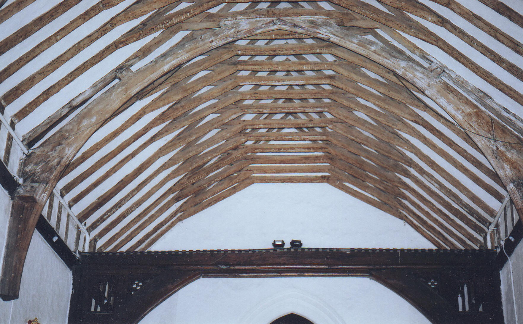 The nave is aisleless but quite wide and has two-light S. windows with supermullioned tracery: '[The] finely executed [nave] roof [shown below], which is single-framed and arched to its collars, must have been an erection task of complexity and difficulty. The arch timbers arecomposite, and their lower pieces approximate to eaves blades since they contain the eaves angle. The collars have clasping ends to hold the principal rafters, and similarly the spur ties clasp the eaves pieces to the arch timbers; the common couples are framed in seven cants' (Cecil Hewitt, Church Carpentry, London & Chichester ,Phillimore, 1982, p. ).