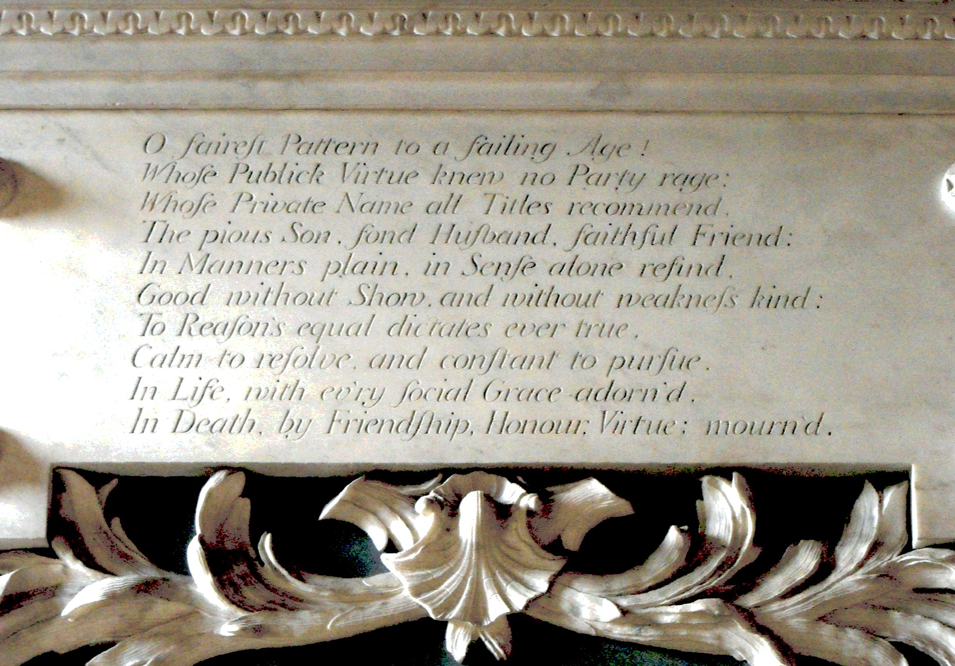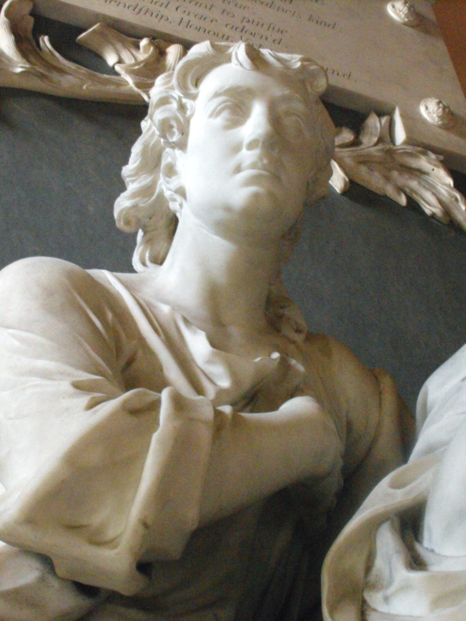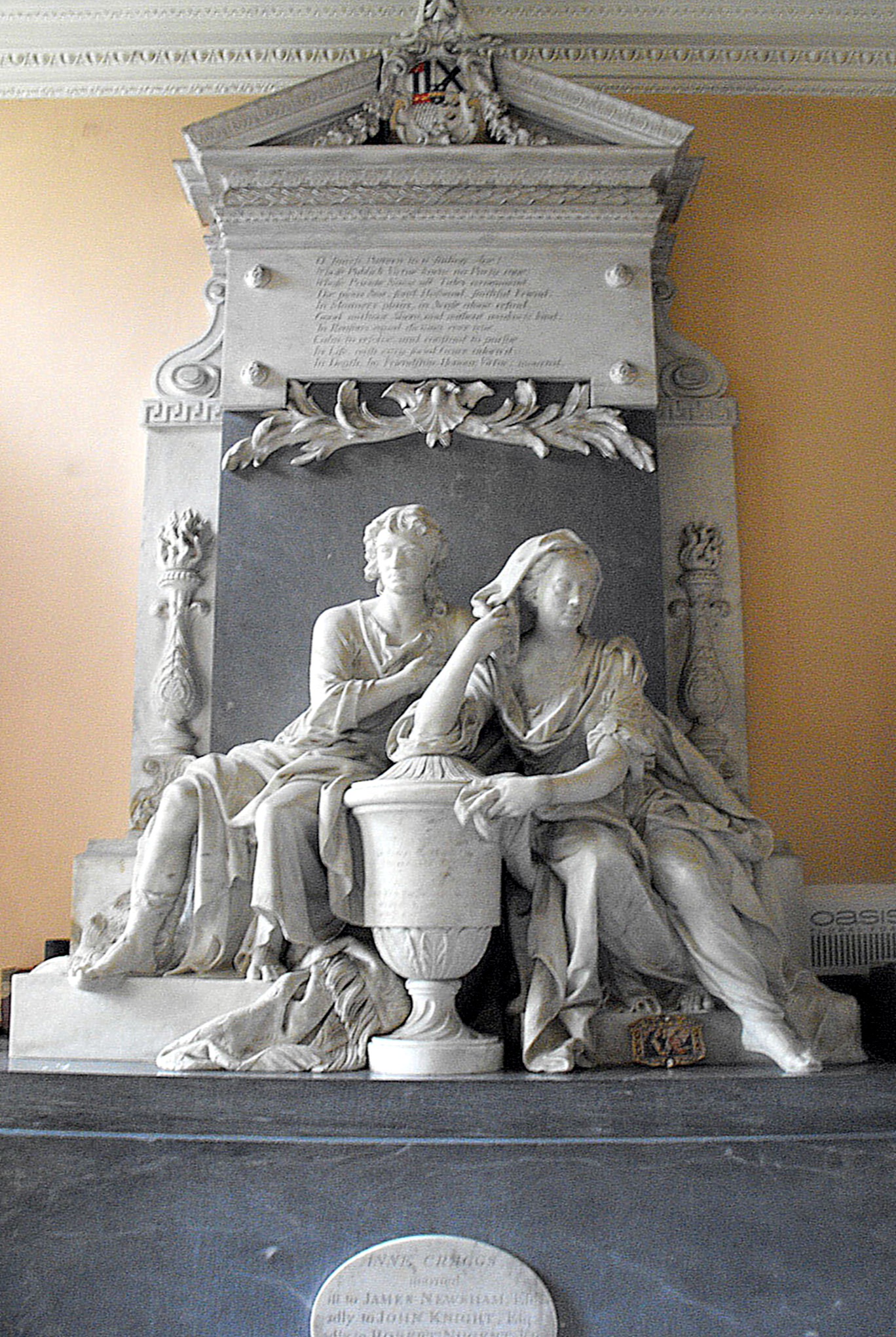 The Knight family pew is a very grand conceit from which it was intended the occupants could look down at the altar over a parapet. Adorned with a magnificent plaster ceiling with a large oval, central panel and elaborate floral designs, and with a Palladian W. window and a doorway enriched with Ionic pilasters at the top of the steps leading up to it from the east, these superior beings might as easily have imagined themselves seated in their own splendid Renaissance drawing room as here in church - at least, had it not been for the fact that the N. wall was wholly taken up with John Michael Rysbrack’s magnificent monument described by Pevsner as "the most ambitious monument in Cornwall", depicting the deceased leaning over to comfort his widow, Anne, who is seated beside him in a an unusually equal position for the time and whose right elbow rests on an urn, intended to represent the eventual mingling of their ashes in death. (See the photographs above and below.) Little more than a decade before this, Anne's sister, Elizabeth Eliot, née Cragg, had also been widowed (in 1722) and had similarly commissioned a monument by Rysbrack (1694 - 1770), in hercase for St. German's church, Cornwall, where it too was graced with an inscription by Pope, a family friend. Elizabeth then behaved in the 'proper' fashion of the age, and under Pope's influence 'embraced Catholicism and followed the Continental pattern of a life of prayerful meditation until her death,' whereas Anne, who obviously had more spirit, promptly remarried, rendering it nevessary, in order to spare her blushes, to hide John Knight's monument 'in a kind of wardrobe' (Matthew Craske, The Silent Rhetoric of the Body, New Haven & London, Yale University Press, 2007, pp. 280-281). 'Pope, who expected widows to behave like his own cherished mother, that is, like a catholic saint, was outraged.'