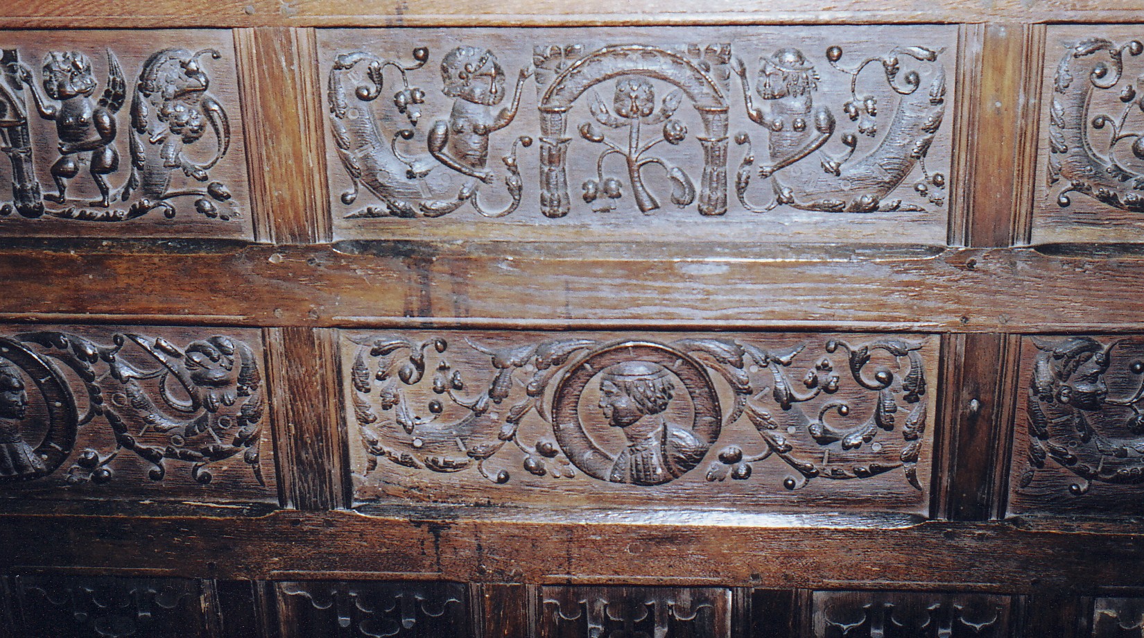 Finally a few words must be added on some of the other church furnishings and additions. Most of the carpentry is Victorian or later but the backs of the choir benches (and, perhaps, their fronts) appear original (that is, of c. 1560 - the time of the chancel’s enlargement) and have linenfold panelling below and panels carved with figures above. (The photograph below shows the panelling behind the choir benches on the S. side of the chancel.) The gated nave benches east of the S. doorway are thought to date from c. 1830 and there is a 'screen-like frame dividing the western bay of the nave from the rest that may have been associated [presumably only briefly if so] with a timber bell-turret' (Church Carpentry, p. 106). The nave E. wall, south of the chancel arch, displays a monument by John Soward (fl. 1802 - 1838), whose work Gunnis describes as 'not very exciting', commemorating John Sparrow (d. 1838) (Dictionary of Brtitish Sculptors: 1660 - 1851, London, The Abbey Library, 1951, p. 361). The S. porch is Victorian.