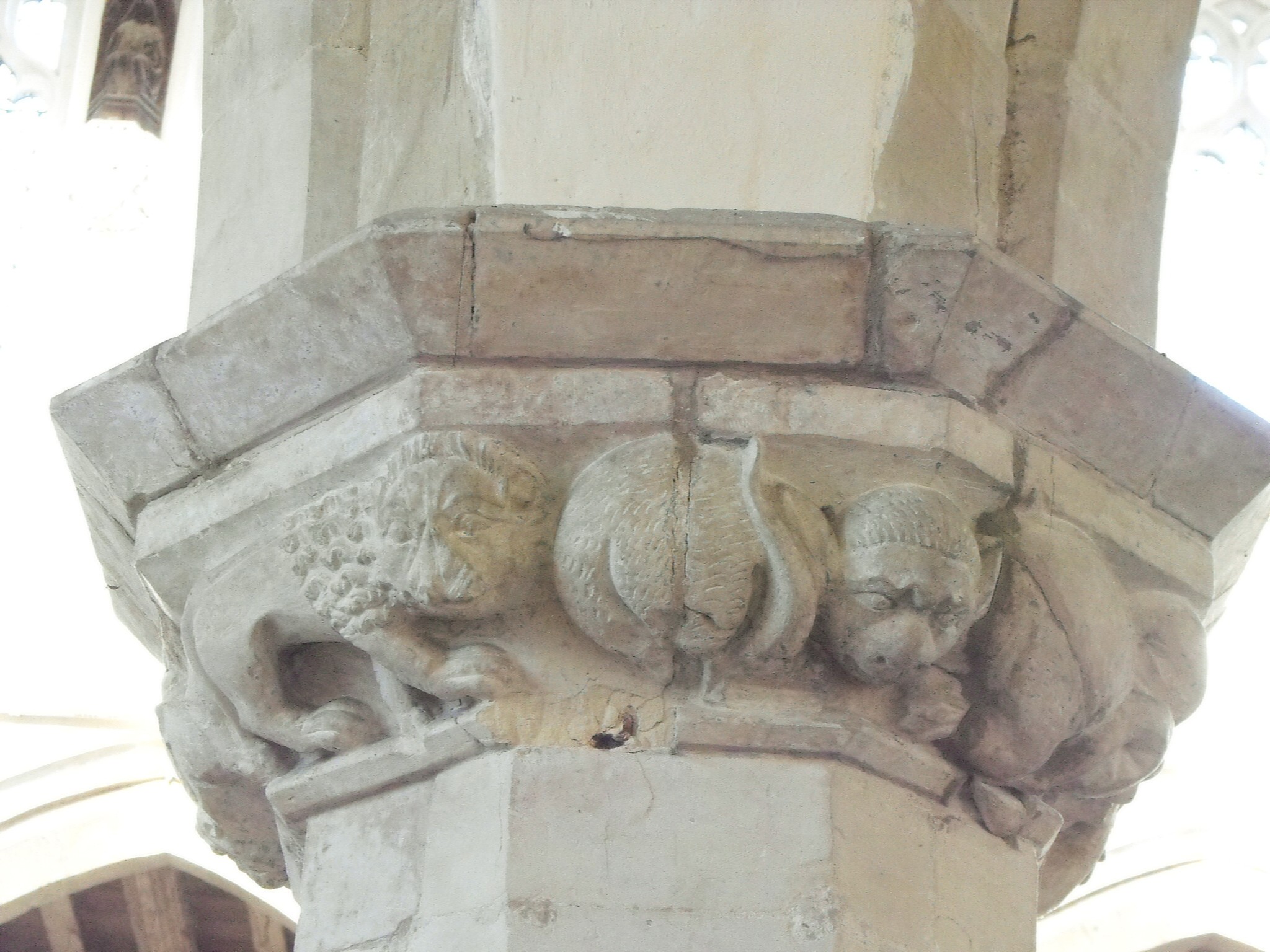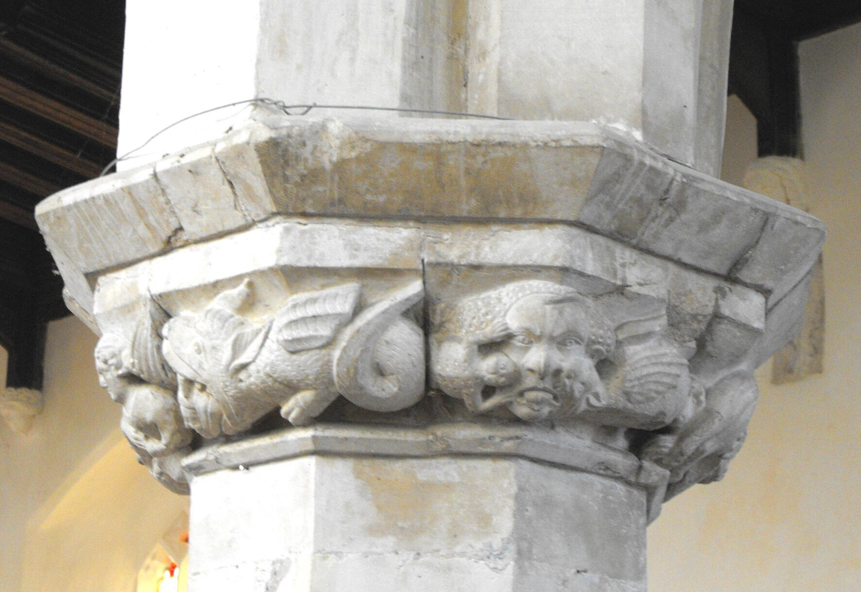Inside the porch, the doorway to the nave (shown below left) is formed of two hollow-chamfered orders decorated with vine leaf, while immediately above are the re-set spandrels of an earlier, steeper arch, displaying carvings of Adam on the one side and Eve on the other, holding out an apple. However, much better preserved carvings are to be seen on entering the church, where the early fourteenth century S. arcade formed of double-flat-chamfered arches springing from octagonal piers, is distinguished by its capitals carved in high relief, and especially so by its western capital, where a lion, a devil, men being eaten by monsters, and a couple of angels are depicted. (See the photographs at the foot of the page, showing this capital from two angles.) The N. arcade (below right) is cruder and perhaps later than its southern counterpart: here the octagonal piers are broader and the arches bear two hollow chamfers; the capitals are conventional. However, there are other carved figures to be seen among the corbels below the wall posts of the nave roof, resembling an assortment of self-satisfied contemporary noblemen. They lead the eyes up to one of the best double-hammerbeam roofs in the county (see the detail in the second photograph down), where the work is likely to be approximately contemporary - even though the angels have since been sawn off. Nevertheless, the leaf carving on the braces, the elaborately carved wall plates, and some of the painting, have survived, and in this well-lit church, can be seen to admirable advantage. The aisle roofs are of simple lean-to construction, but solidly made, of which that to the south has carved leaf bosses and short wall posts, again supported on corbel heads.