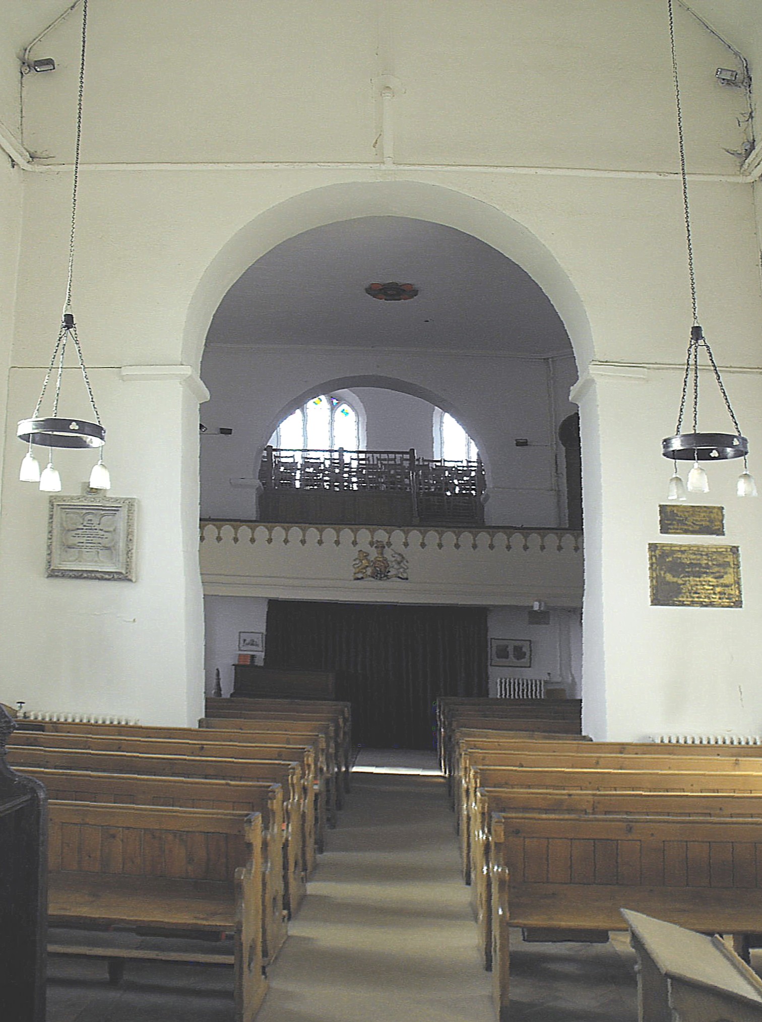 Inside the church, the tower arches are massively Norman to the east and west, and entirely unmoulded except for the chamfered under-edges of the abaci. (See the photograph above, looking west from the chancel.) The S. arch is triple-flat-chamfered and probably Early English, and the N. arch is Perpendicular and composed of a sunk quadrant moulding above short responds . These arches suggest the transepts were added to the church in the thirteenth and late fourteenth centuries respectively, cutting through, on each occasion, the Norman tower walls, for although Pevsner assumed the church was originally cruciform, there is no supporting architectural evidence and, indeed, the truncated openings, previously mentioned, just visible above the transept roofs, seem to imply the very opposite. The chancel has a three-bay stepped sedilia and a piscina recessed in the S. wall, but both are so drastically restored that the original forms are lost. Nor does the church contain any other furnishings or fittings of significance, though mention might be made of two fifteenth century benches with traceried panels beneath the crossing, and of a nearby chest on wheels, apparently considered, with something less than perfect precision, to be Flemish, Dutch or German in provenance, and sixteenth or seventeenth century in date!