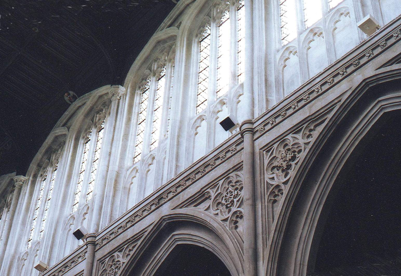 The nave arcades are constructed in seven bays (of which the N. arcade is shown left) yet there are eight windows in the long aisle walls, a disaccord which is not immediately striking as the aisles are so wide. The arcade arches are of complex profile and supported on compound piers with semicircular shafts at the cardinal positions. The shafts towards the nave and aisles continue up between the clerestory windows, to reach the wall posts of the roof. This was Wastell's scheme at Lavenham and Great St. Mary's, Cambridge, also, although it was a well established arrangement by this time, having previously been used by Reginald Ely among others, at St. Mary's, Burwell (Cambridgeshire), for example, in 1461. Wastell's design, however, by introducing a horizontal frieze above the arcades, decorated with fleurons, is both more ornate and less unified (see the photograph at the top of the page), for the arcades and clerestory are not drawn together in the way that Ely achieves, and although, in this case, Wastell retains the blank arches, like those at Burwell, below the clerestory windows, these are consequently not carried down into the arcade spandrels below, which contain instead an opulent display of mouchettes and double-cusped quatrefoils in circles. It may be coincidental, but this is very much an intermediate design between Ely’s work at Burwell and Wastell’s own work at Lavenham.