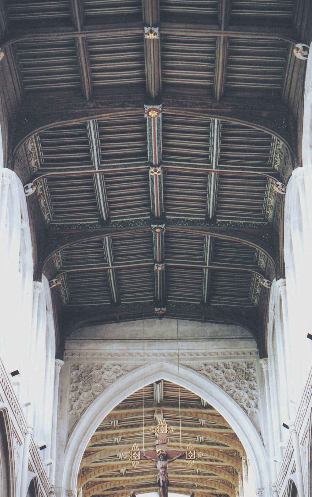 The church roofs are everywhere of the early sixteenth century except, it appears, in the chancel, which Cecil Hewett considered to be a late fifteenth century piece (Church Carpentry, London & Chichester, Phillimore, 1982, p. 126). What he did not appear to know was that this roof reputedly came from St. Gregory’s, Sudbury (Suffolk), although that seems remarkable if true, and, given the immense difficulties of heavy cartage in those days, of doubtful saving in cost or labour. (The photograph, right, shows the nave roof with the chancel roof behind, through the chancel arch.)