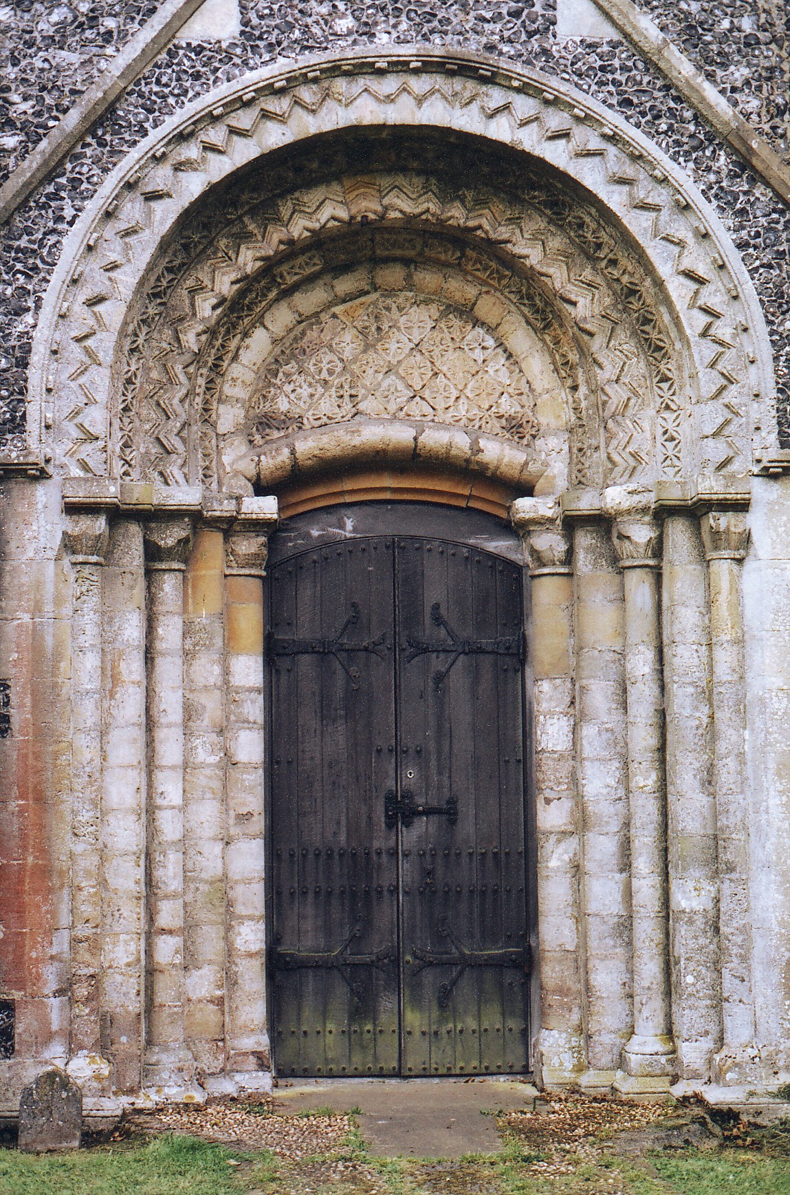 However, the most important pre-nineteenth century architecture remaining in the present building is Norman and includes the N. and S. doorways, of which the former (above left), re-set beneath a shallow gable in the N. aisle, is slightly the more impressive, being composed of five orders - albeit with shafts with scalloped capitals to the first, third and fifth only - displaying, from the outside in, first billet moulding, and then two orders of chevron and two rows of saltires alternately, around a diapered tympanum supported on a curved lintel. The S. doorway (inside the porch) is composed of four orders, with shafts beneath the second and fourth only and with chevron around the outer two, saltires round the third, and a shallow roll around the fourth, within which the tympanum is patterned with triangles. Then a third major piece of Norman work, this time inside the building, is the chancel arch (shown above right), formed of three orders with chevron moulding above shafts with leaf volute capitals to the central order and a strange row of cabbage-like protuberances around the outer, like prototype ball flower.
