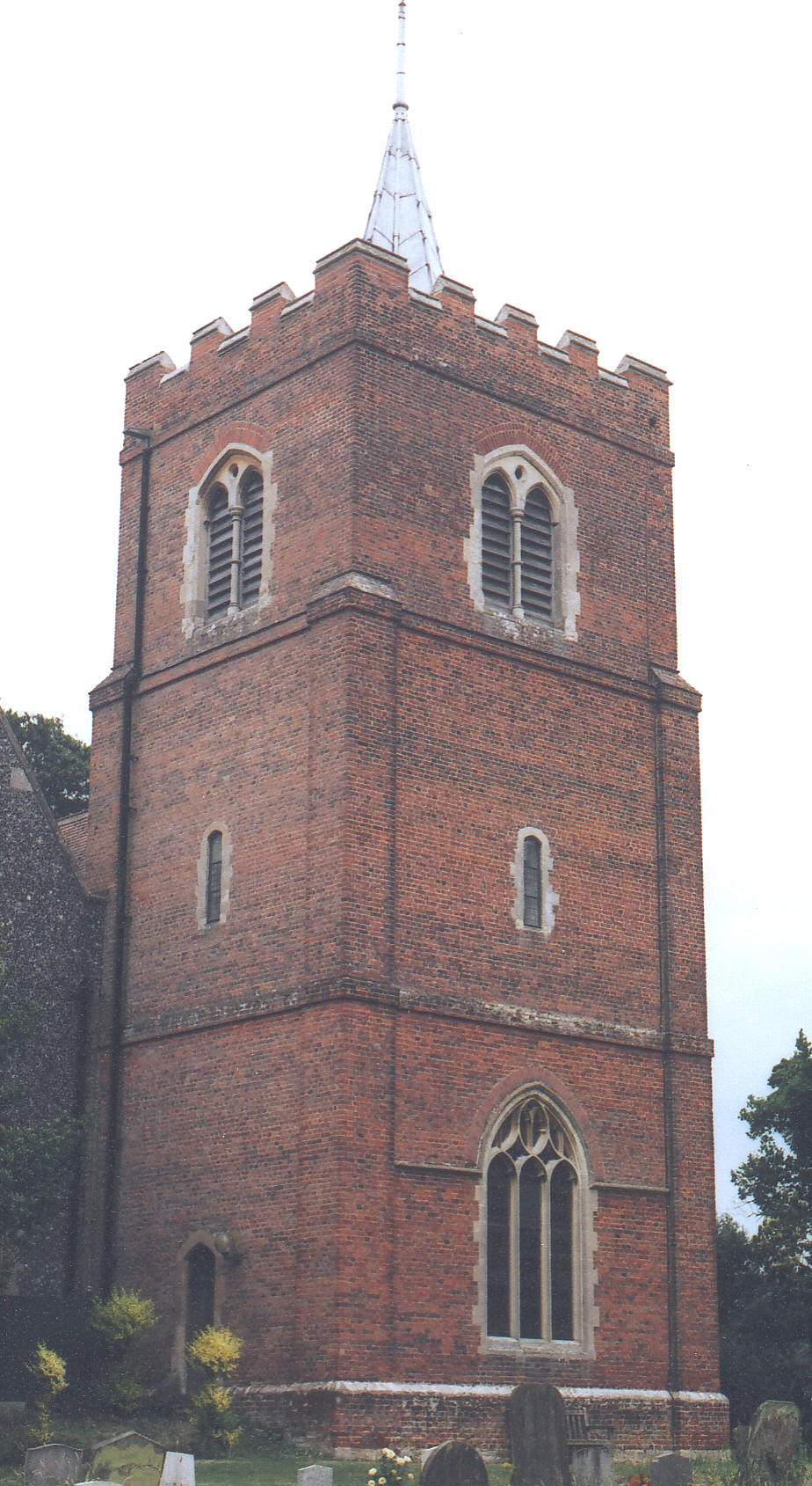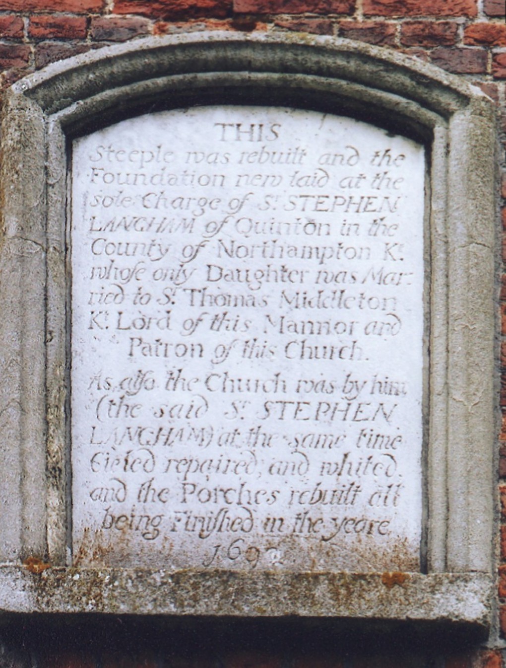 It is the tower (shown above left, from the northwest) that is likely to strike the visitor first, however - either that or the rather oppressive way in which Dollman has faced the whole of the long nave, independently-gabled N. aisle, chancel and N. chapel, with knapped flint, in an unrewarded monument to labour and expense. Equally unattractive are the bell-openings and W. window he has inserted in the tower, which have the effect of making one doubt, at first, the English-bonded brickwork as evidence of its early date, at least until one notices the inscription on the S. wall (illustrated above right), which reads, 'This steeple was rebuilt and the foundation new laid at the sole charge of Sir Stephen Langham of Quinton in the county of Northampton, whose only daughter was married to Sir Thomas Middleton, Lord of this Manor, patron of this church, as also the church was by him, the said Sir Stephen Langham, at the time tiled, repaired and whited, and the porches rebuilt, all being finished in the year 1692'. The tower rises in three stages to battlements and is supported by very shallow clasping buttresses. Behind the battlements there is a fat, leaded spike.