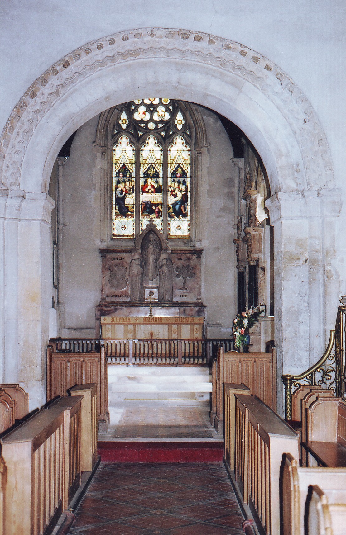 We should probably be grateful that this Romanesque work, fragmentary though it is, was found a place in Dollman’s reconstruction of 1888: it might have had less chance of survival had he worked on the church three or four decades earlier, in the more stylistically doctrinaire atmosphere then prevailing. As it was, Dollman adopted the favoured Second Pointed style for his original work here but showed little inspiration in so doing and thus his window traceries seem conventional and tired. Nor do they succeed in allowing much light to enter the building, which is positively dismal inside, even though the N. aisle windows now hold clear glass. The five-bay N. arcade is also Dollman’s and formed of double-flat-chamfered arches springing from circular piers and, at either end, a corbel shaft. The roofs are Dollman’s too, that to the nave resting on marble shafts and - in an unnecessarily complicated arrangement - with coving beneath to the south, that rests on a further series of shafts rising from corbels, the purpose of which is to bring the roof forward of the wall in order to align it with the tower. Dollman also restored the two separate arches that lead from the chancel to the N. chapel, although these appear to have at least a basis in the thirteenth century, in the case of the western arch, and the late fourteenth, in the case of the eastern, suggesting that the chapel was extended eastwards at that time. (They bear a keeled roll and a sunk quadrant respectively and the former has leaf volute capitals.) There is rather more important early work to be seen on the S. side of the chancel, where the first and second windows from the east retain thirteenth century side shafts and are separated by a similarly adorned blank arch. The E. wall has been reconstructed but still has thirteenth century shafts in shaft-rings in the angles.