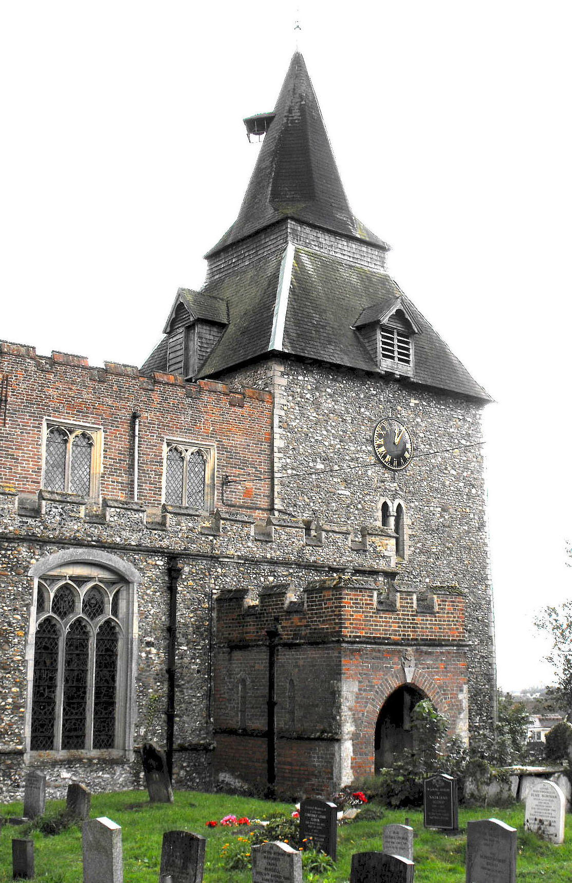 The most notable feature of this building is the squat, unbuttressed early thirteenth century W. tower (shown left, from the northeast), with two-light bell-openings each consisting of a pair of lancets separated by a shaft with a capital, and opening internally to the nave through a wide pointed arch which is entirely unmoulded save only for the chamfered under-edges of the abaci. The short shingled spire, formed of a lower stage with dormer openings and an upper stage of broach form, was examined in detail by the late Cecil Hewitt and ascribed to the final quarter of the thirteenth century (Church Carpentry, London & Chichester, Phillimore, 1982, pp. 64, 66 & 135-136). Four secret notched laps are used in the frame - a carpentry joint employed from c. 1220 until they were succeeded by tenoning - and the frame is elaborately saltire-braced in a manner showing 'the separate traditions of straight and bent-wood usage'.
