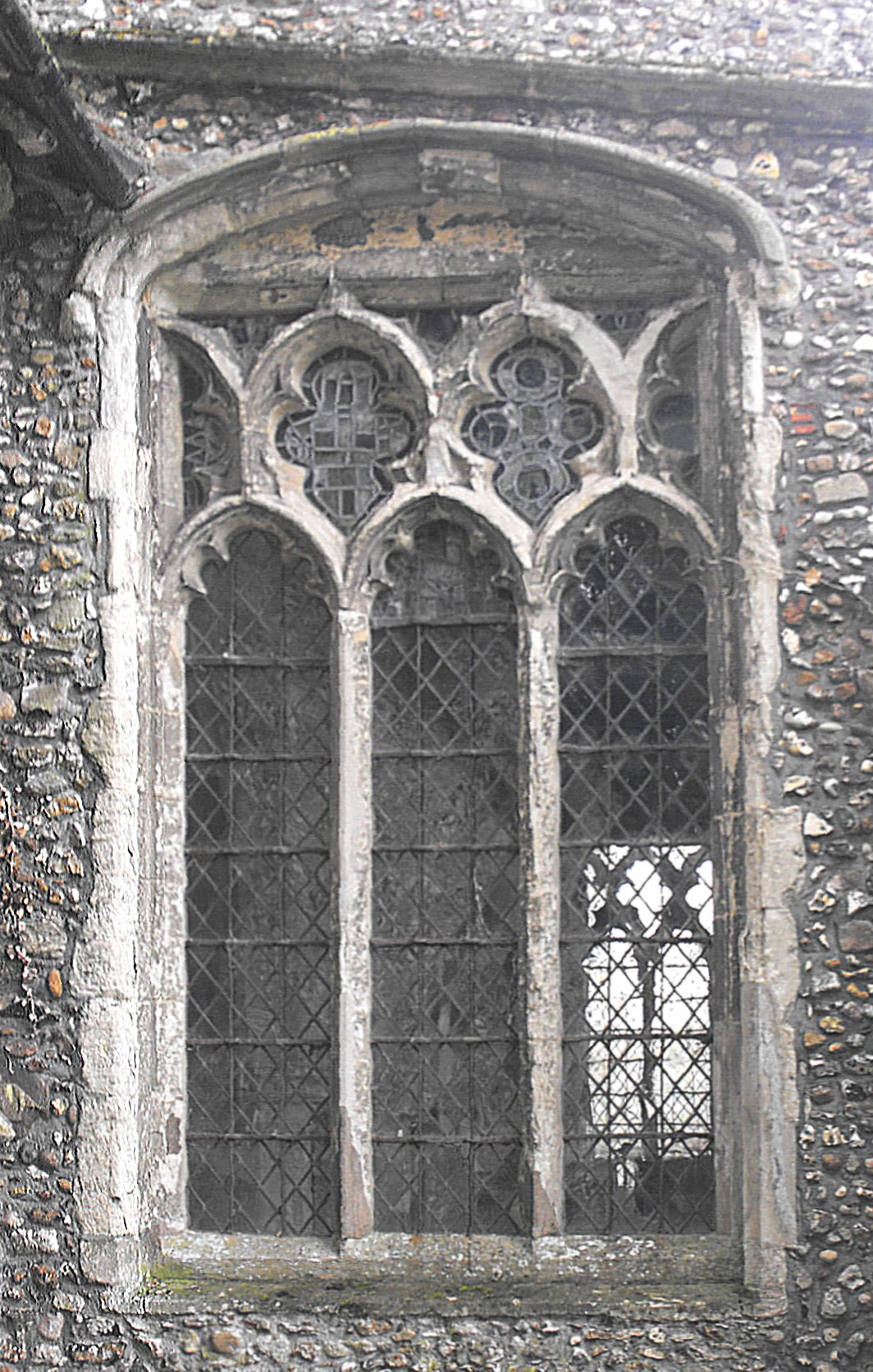 The Decorated chancel would fit a date around 1340. It is lit by a three-light window to the east, with standard reticulated tracery, and one rather odd two-light window in each of the north and south walls of the sanctuary, featuring ogee-pointed lights and misshapen quatrefoils above. The re-set E. window in the Victorian vestry has cinquefoil-cusped Y-tracery and a transom. Inside, the N. and S. walls of the chancel are each decorated with four bays of blank, unmoulded arcading. A double sedilia in the south wall continues eastwards in similar style, while the double piscina further east again has double-cusped Y-tracery supported on a shaft with a capital, and a quatrefoil in the eyelet above.