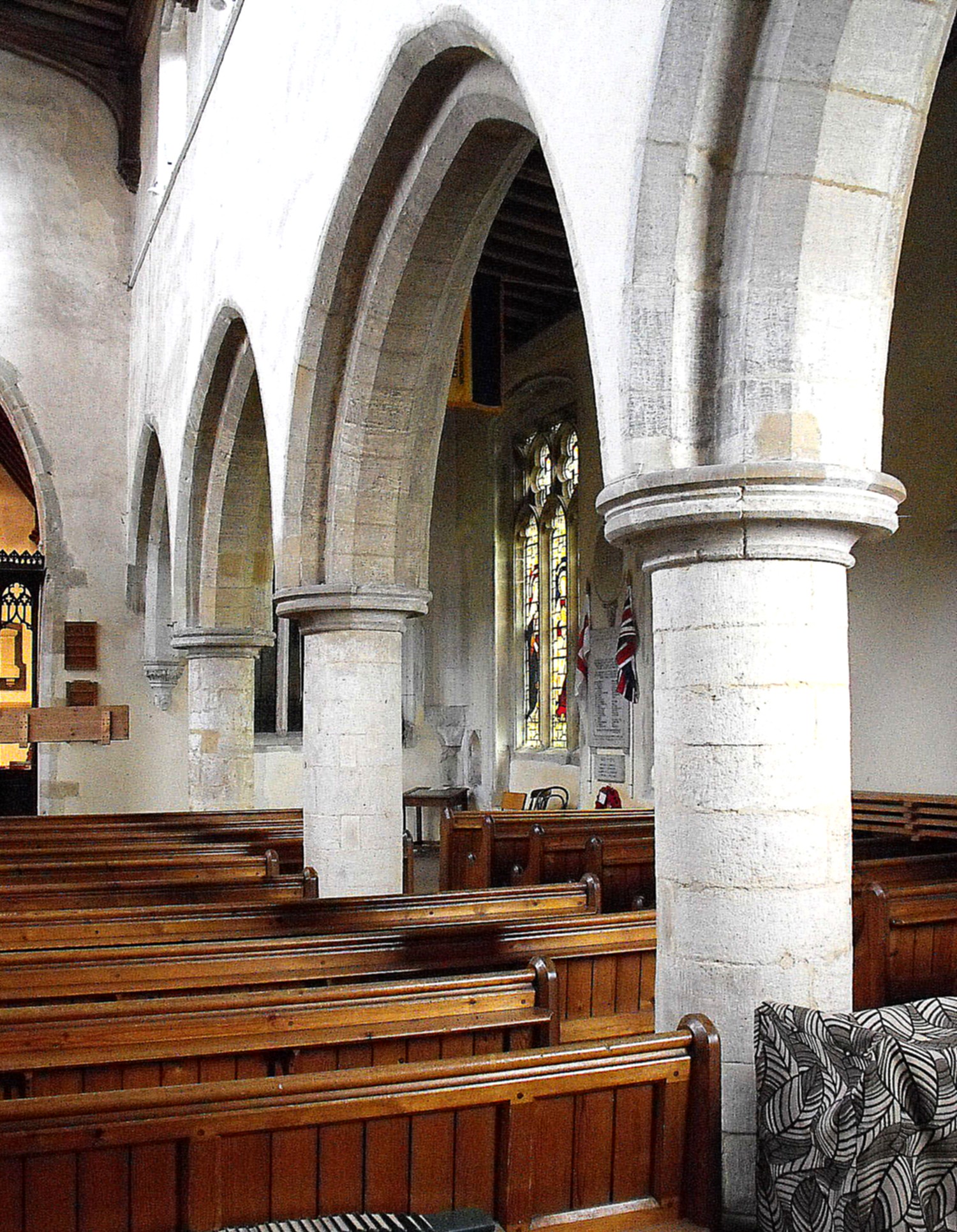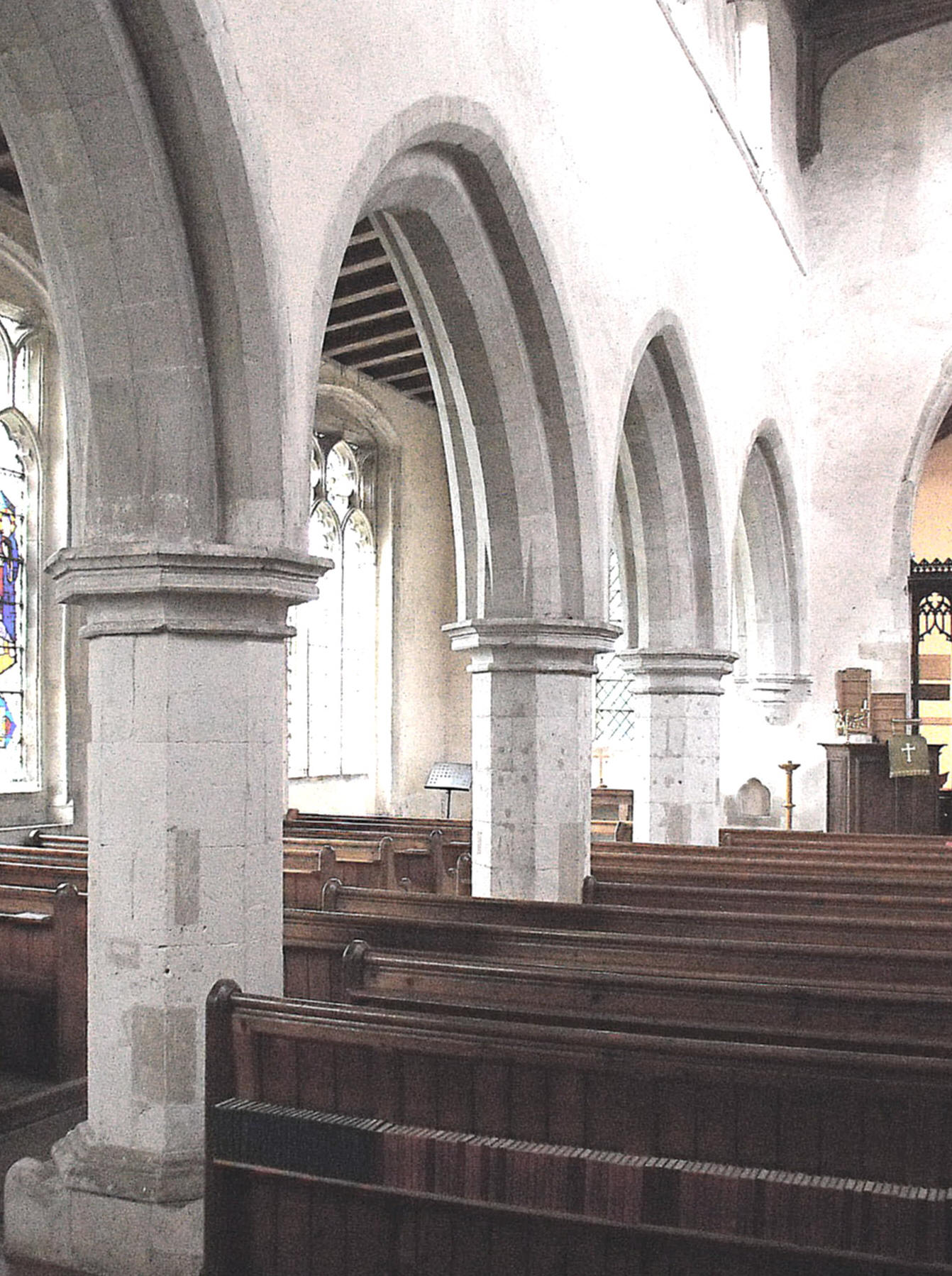 The rest of the church is formed of a chancel with a Victorian S. vestry (sic), and an embattled, aisled nave with N. and S. porches. The S. arcade (shown below right) is thirteenth century in date, although as Pevsner observed, 'probably later than the tower' (James Bettley & Nikolaus Pevsner, The Buildings of |England: Essex, New Haven & London, Yale University Press, 2007, p. 825), being composed of four double-flat-chamfered arches supported on circular piers with nicely moulded circular capitals. The N. arcade (below left) seems to have been constructed about a century later and may be contemporary with the present aisle windows, described below: the piers on this side are octagonal, with octagonal capitals, and there are broaches where the inner flat chamfer of the arches meets them.