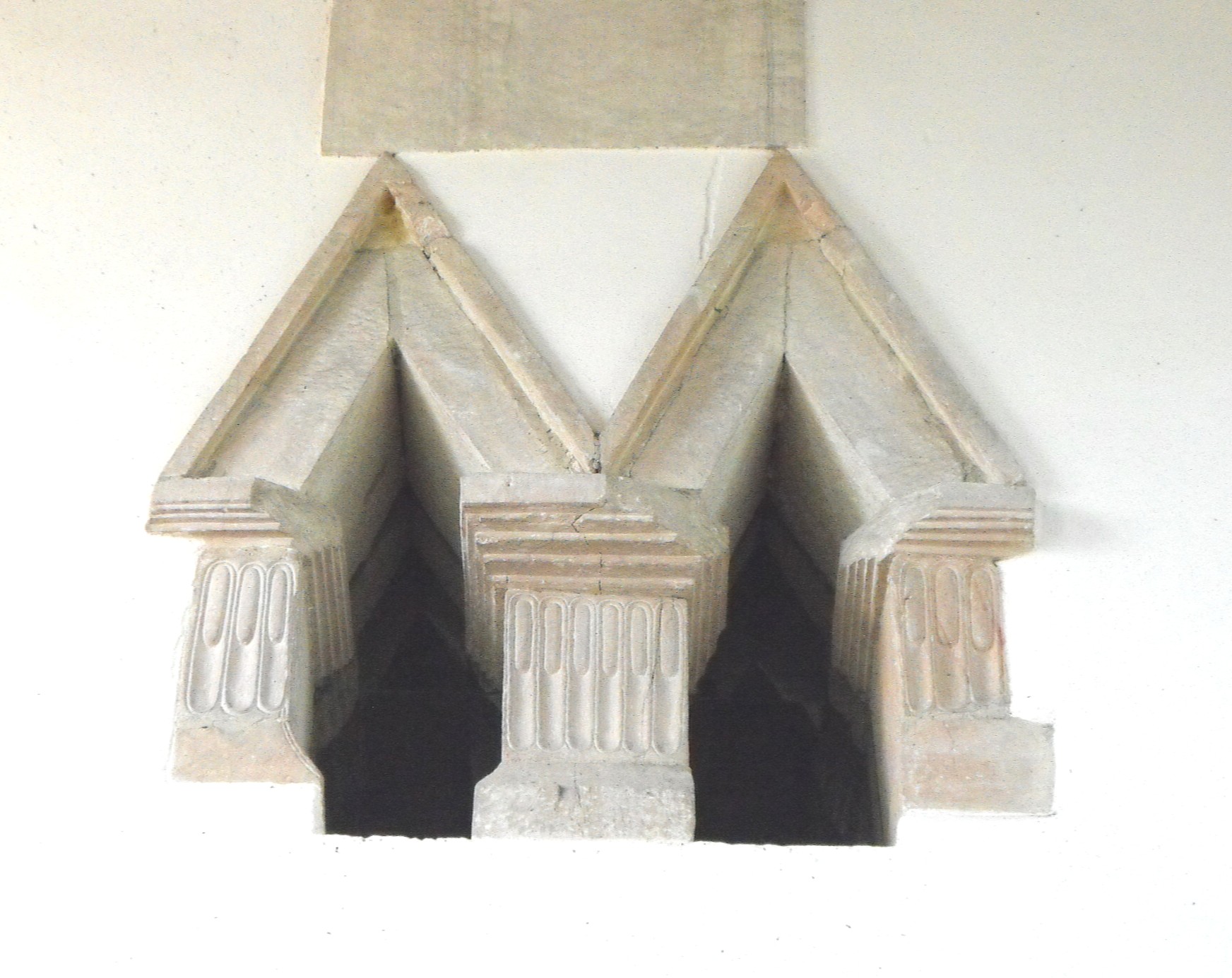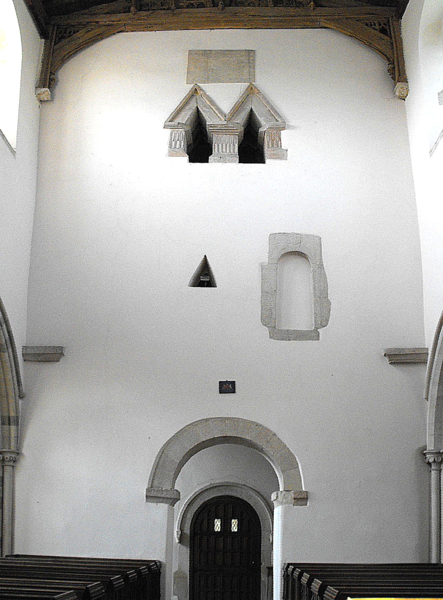 Ninth and tenth century alterations to the church seem subsequently to have included, besides the replacement of some of the upper parts of the structure in stone, the heightening of the western adjunct to the nave - probably now used as a porch - to provide an upper storey, the redevelopment of the semicircular apse into a grander (and taller), semi-polygonal (seven-sided) one (Philip Rahtz), and the erection of more porticus, abutting each other north and south of the apse and nave, but chiefly on the north side. This was the time when herringbone work was introduced and to which much of the building's sculptural detail can probably be ascribed (but see below). It was the period responsible for the famous, double-triangular window between the nave and upper storey of the porch (shown below, first in an overall view of the W. wall of the nave and then close up).