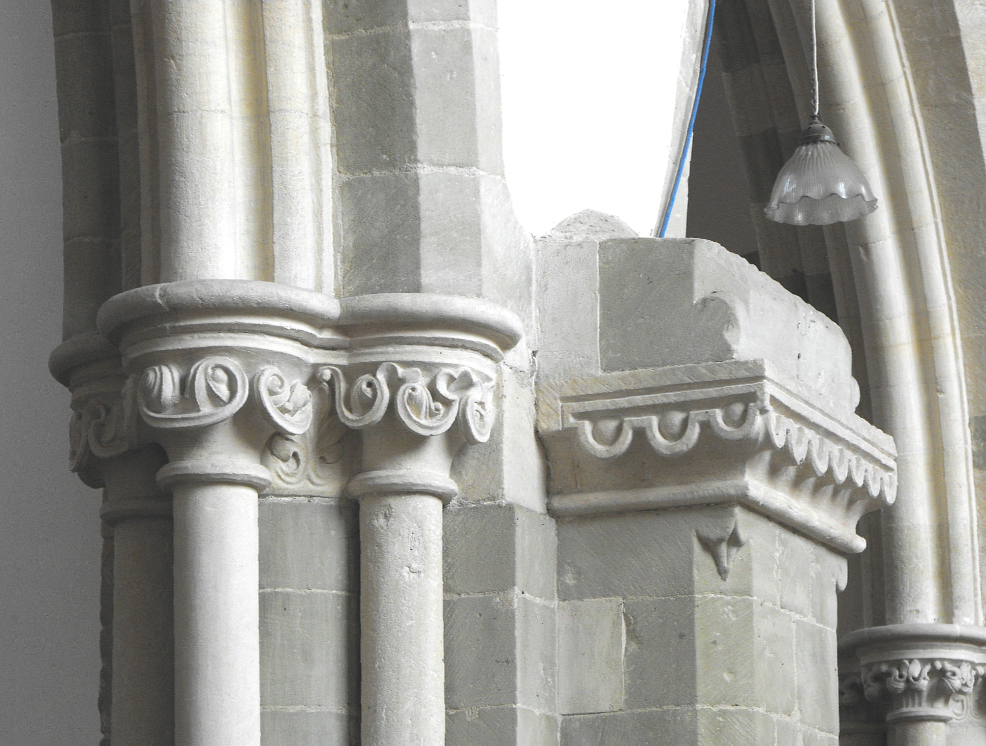It was left for the eleventh century - either before or after the Conquest, or both - to sweep up the motley collection of porticus into aisles running from the E. wall of the crossing to the W. wall of the porch, and to raise the porch by a further two stages to form a tower capped by a saddleback roof. The three arches cut through the N. & S. walls of the nave in the course of these operations, reveal the remains of earlier piers on the sides facing the aisle. In the form today they are probably early thirteenth century in date, though hardly of standard form. The arches carry a flat chamfer and a wave, and although the two orders of shafts below are conventional enough, the decoration around their necks is very curious: David Verey and/or Alan Brooks (in the volume of The Buildings of England for the Vale of Gloucester and the Forest of Dean, New Haven & London, Yale University Press, 2002, ) calls it 'early stiff-leaf', but that is stretching the definition to the point destruction. (See the two photographs below, both taken from the southwest.)