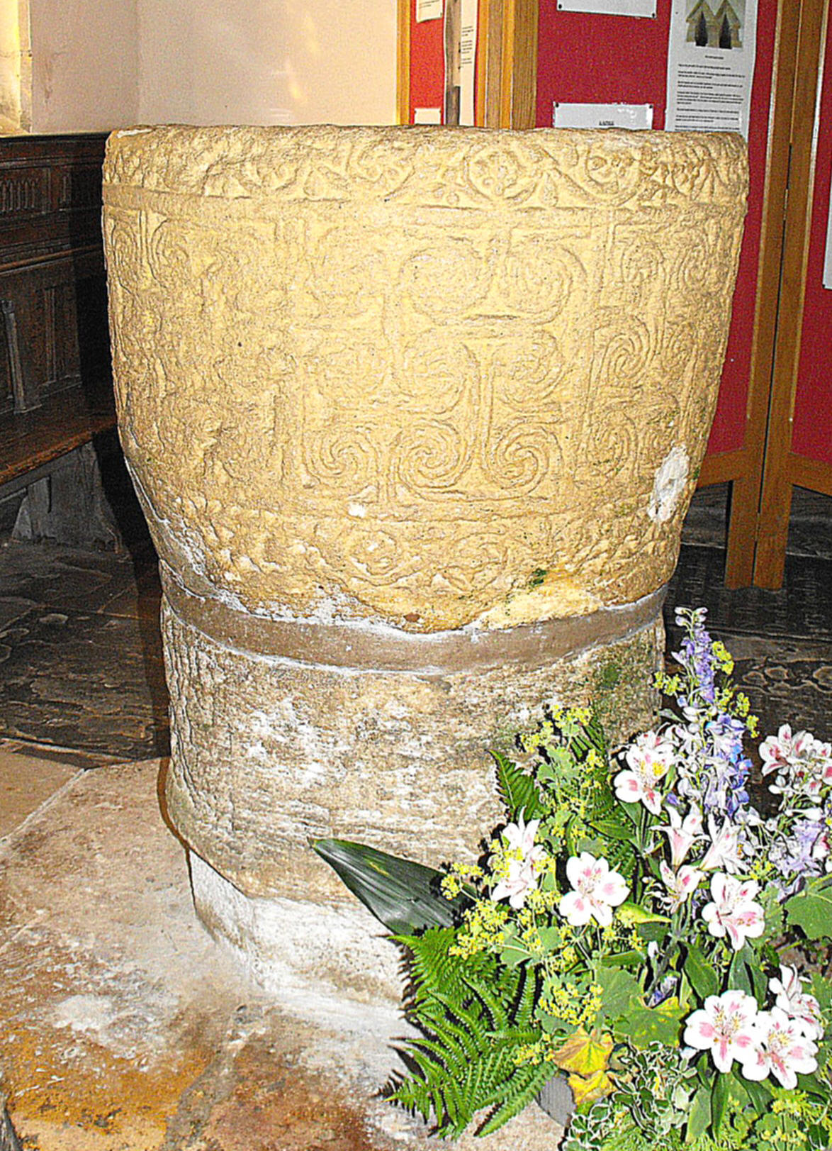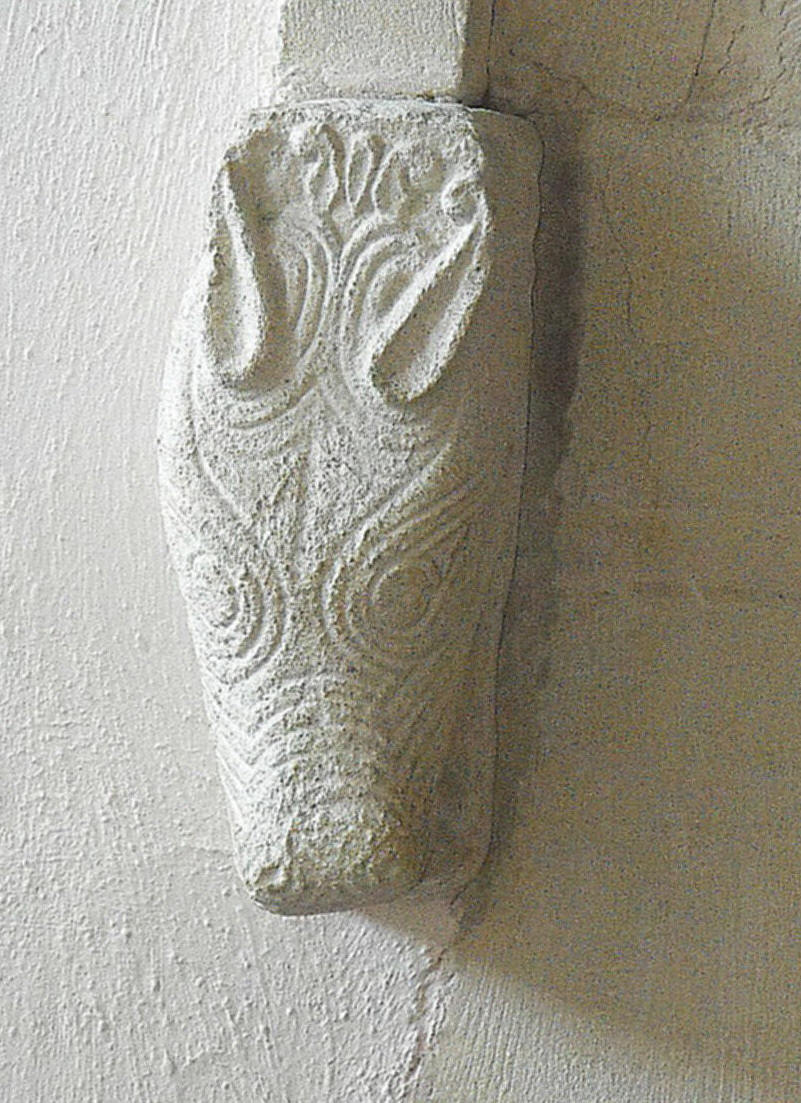 Considered in general, however, sculptural decoration around the building is more important for its age than for any other merit it might possess and includes the font (below left), which is covered in incised double spirals set in squares which Sir Alfred Clapham considered a design 'almost identical... [to that] on a pendant found in the Trewhiddle hoard.., fortunately... very closely dated, by the accompanying coins, to about the year 875' (ibid., p. 129), and Richard Bailey, writing in Anglo-Saxon Sculptures at Deerhurst (The Friends of Deerhurst Church, 2005, p. 20) dated three quarters of a century earlier, precisely because it is not like the decoration on the carving in the Trewhiddle metalwork. Still more acute is the disagreement between the two men over the age of the beast heads found as label stops (not necessarily in situ) in various parts of the building. (The example illustrated below right, can be seen on the inner face of the tower W. doorway.) Clapham thought most of them were late Saxon work, perhaps even from the post-Danish period (1042-66), while Richard Bailey argues they could date back as far as c. 800. He, of course, writes with the benefit of seven further decades of modern archaeological research, yet if anything is reasonably certain, it is probably that this is not the last word.