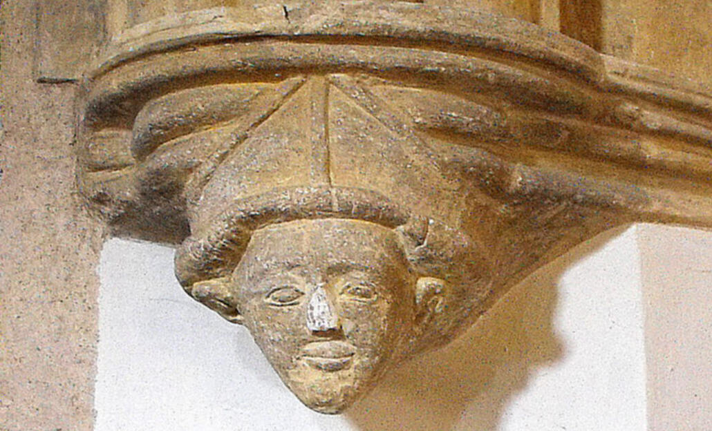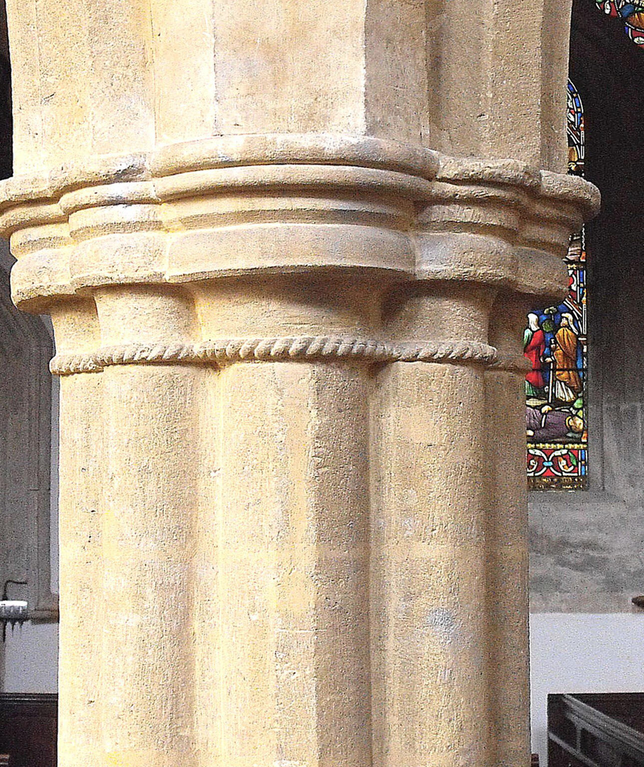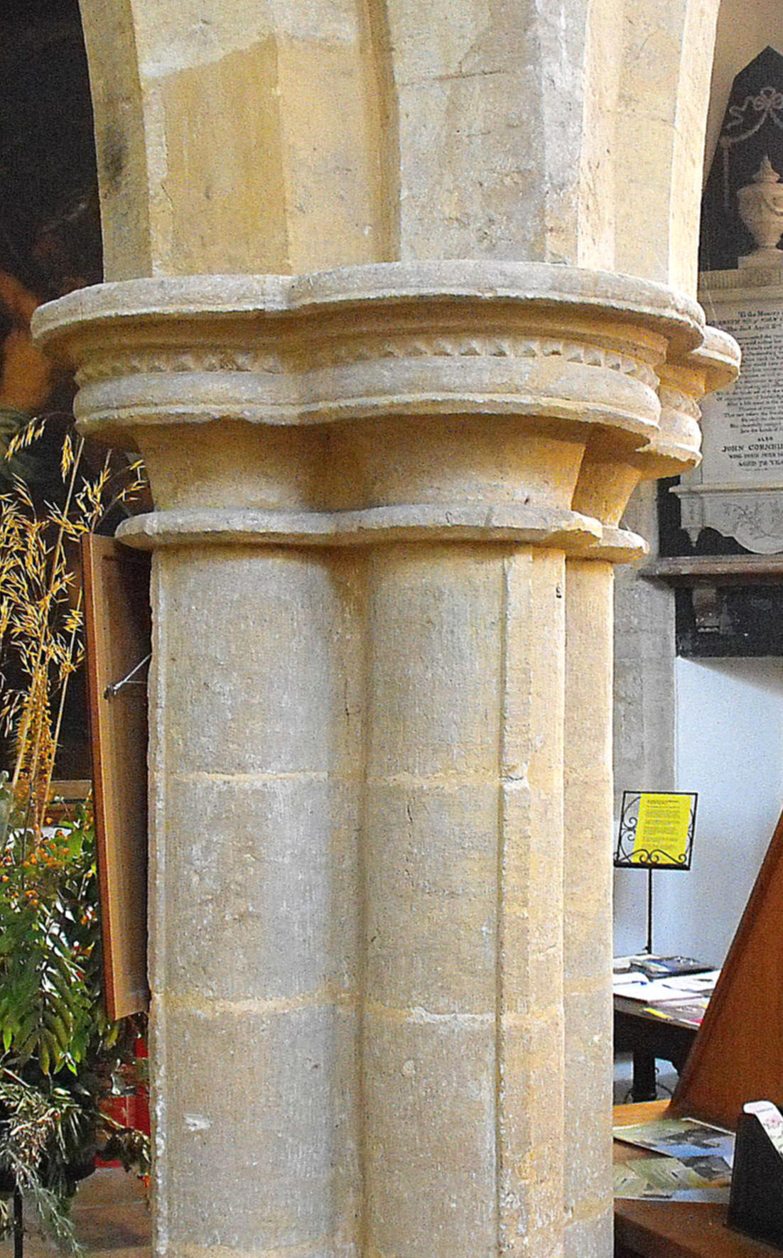 In fact the oldest masonry in the church is probably Norman, to judge from the lower parts of the west wall of the nave. These are not very informative admittedly, but the Early English work inside is another matter altogether and proves that by the mid to late thirteenth century, there was a church on this site of similar dimensions to the church here today. The S. arcade is three bays long and a simpler version of its counterpart to the north (see the internal view of the nave at the top of the page, taken from the east), suggesting it is the earlier. It consists of double-flat-chamfered arches supported on quatrefoil piers (an example of which is shown above left) with fillets running down the foils and nailhead round the capitals, and opens to an aisle one bay in width, just half that of the N. aisle opposite, which advertises its breadth with a two-bay arcade separating it from the transept, composed of arches carrying a flat chamfer on the outer order and two shallow rolls on the inner, supported on a central pier composed of eight shafts without fillets, a respond formed of three shafts to the south, and a head corbel to the north (illustrated below). The N. arcade between the nave and the aisle, is four bays long, with an easternmost arch opposite the tower, leading into the transept. This is formed of triple-flat-chamfered arches supported on piers composed of clusters of eight shafts, with fillets in the cardinal directions, cable moulding round the tops of the shafts, and nailhead above, around alternate capitals only. (See the example, above right, which lacks the nailhead decoration.) This arcade is presumably contemporary with the two plate-traceried N. aisle windows (of which that to the east has since been renewed), each displaying: outside, a pair of lancet lights with side shafts, set inside an encompassing arch with a second order of shafts and a small trefoil above and between; and inside, another order of shafts beside the deep splays. The tower opens into the S. aisle to the west, through a plain pointed arch that may be re-set. The wide, round arch to the chancel, bearing two flat chamfers which die into the jambs, may be the result of reconstruction.