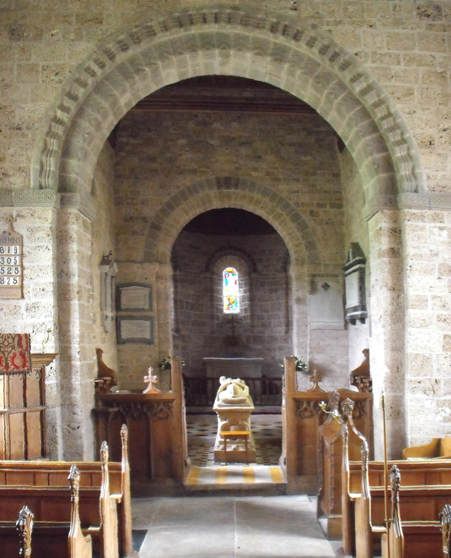 Inside the church, it is easy to imagine how the building would have appeared when originally constructed, albeit that one obvious difference is that with the large inserted windows, it is considerably lighter now. Nevertheless, the view towards the east is still an atmospheric one (see the photograph, below left), dominated by the chancel and apse arches (according to a leaflet in the church, reconstructed from the original materials), and the apse E. window beyond, set in its deep splay. Examination at close quarters shows the chancel arch to be formed of two orders decorated with chevron moulding in different planes above abaci carved with saltires, whilst the arch from the chancel to the apse is composed of two blank orders above plain abaci with chamfered under-edges.