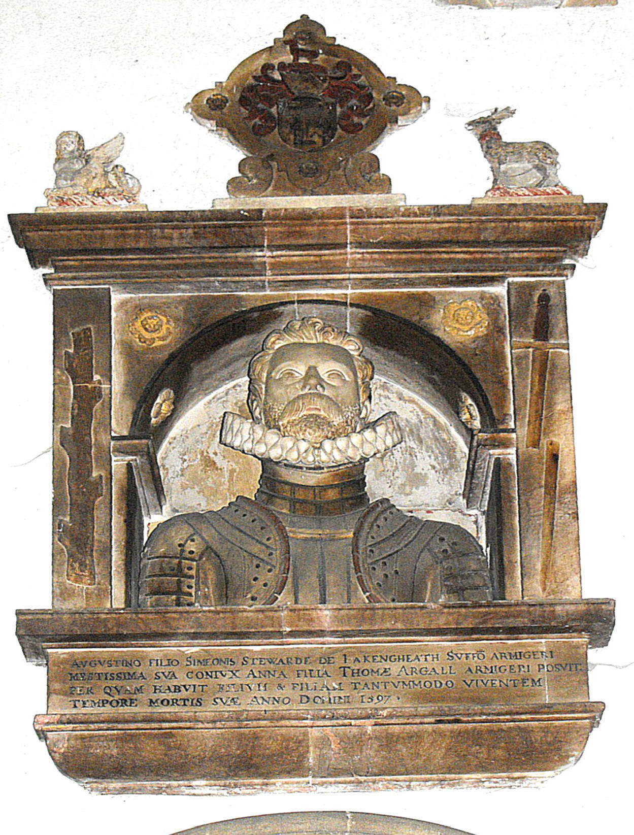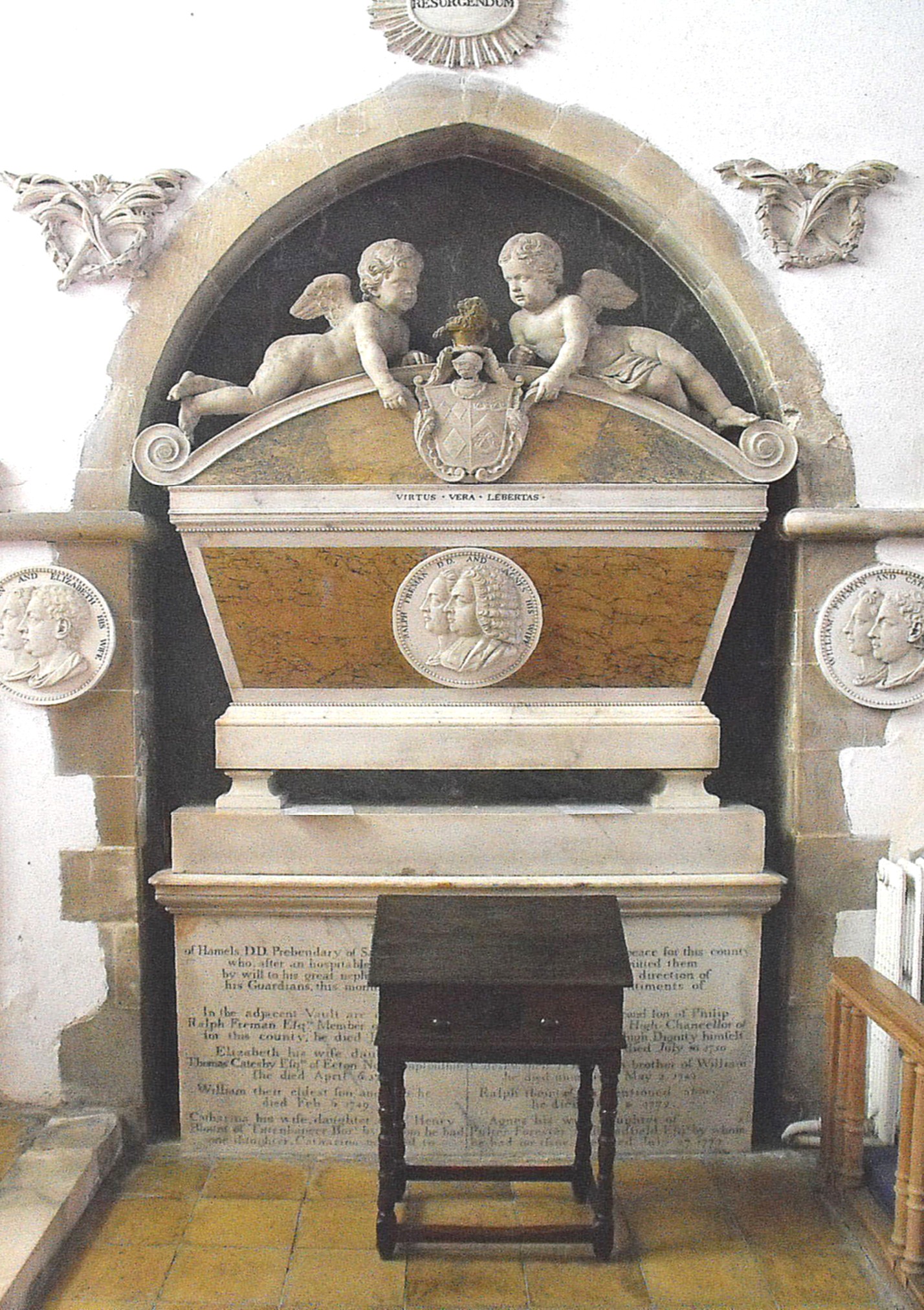 The chancel contains several significant monuments, including two especially large ones facing each other across the sanctuary. The one to the north (above left) commemorates John Brograve (d. 1625) and his younger brother (The Buildings of England: Hertfordshire) and features effigies of two men, lying awkwardly, one above the other, clad in armour, beneath a round coffered arch in brown alabaster, with brown Ionic columns at the sides, supporting an entablature and cherubs above, separated by an achievement. The monument to the south (above right) is dedicated to Ralph Freeman (d. 1772), his wife Elizabeth, and four of his forebears, viz. another Ralph Freeman (d. 1742) and his wife Elizabeth, and William Freeman (son of the elder Ralph) (d. 1749) and Catherine his wife. This was listed by Rupert Gunnis (Dictionary of British Sculptors: 1660-1851, London, The Abbey Library, 1951, p. ) as the work of Thomas Scheemakers (1740-1808), son of the more famous Peter, working in collaboration with James Stuart ('Athenian Stuart') (1713-88), and comprises two well-fed cherubs pointing to an achievement above a marble sarcophagus flanked by medallions and with a third one attached, depicting the three couples in profile, the male in front in each case. Further west in the same wall, a monument above the priest’s doorway, displays a frontal bust of Augustin Steward (d. 1597) (www.britishlistedbuildings.co.uk), set in a square surround (below left).