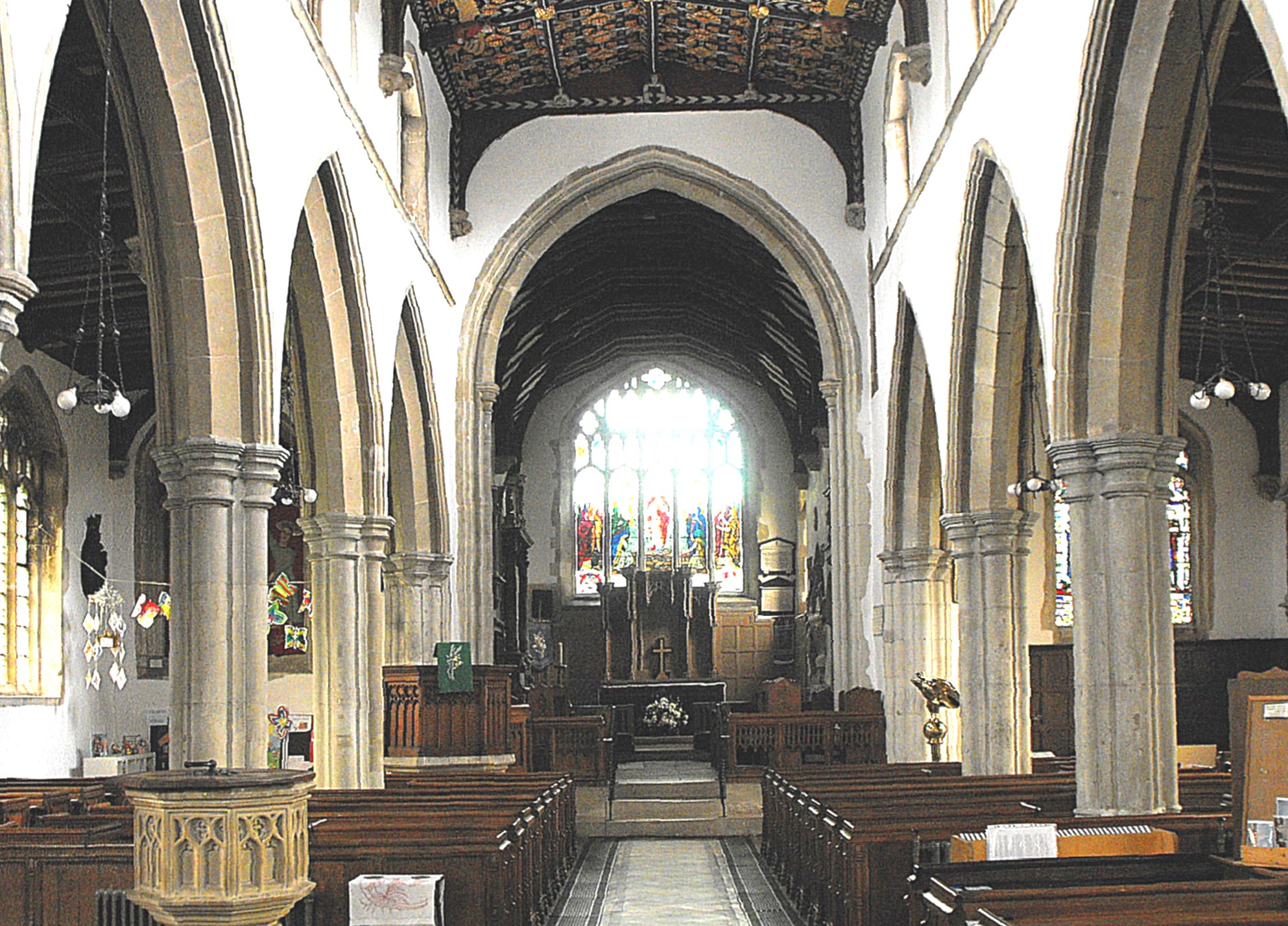 The nave roof retains its mediaeval wall posts, principal rafters, and carved wooden figures. The wall posts rise from an interesting display of carved figure corbels, further examples of which can be seen in the aisles. The east end of the nave roof is covered over with a renewed 'canopy of honour', partly gilded and partly painted in blue. Other furnishings include the original font at the E. end of the N. aisle, with an octagonal bowl decorated with trefoiled blank arches and a plain stem. A tiny trefoil-cusped ogee squint looks through from the N. aisle, almost due south to immediately behind the chancel arch, presumably for the benefit of any priest officiating here at a subsidiary altar.