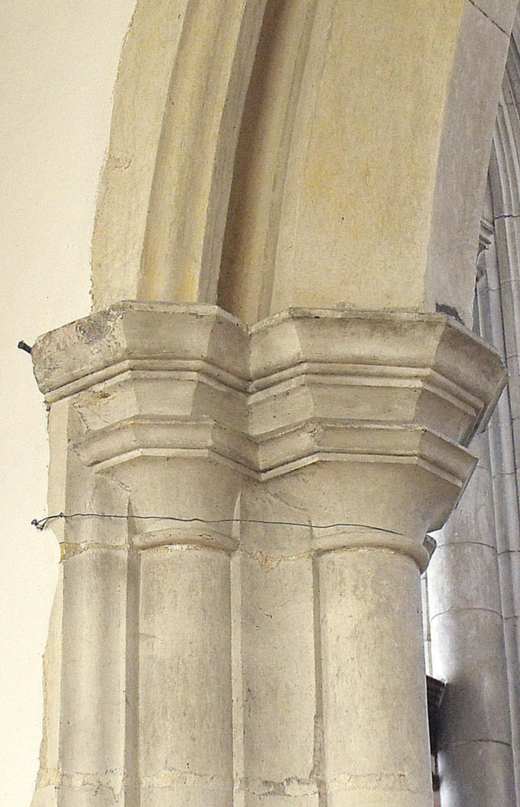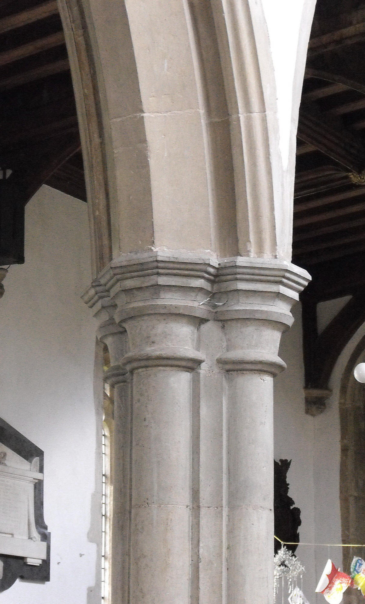 The very tall porch inner doorway has traceried spandrels beneath a heavy rectangular surround. Passing through this into the nave, careful observation discovers another major alteration to the original work, witnessed, in this case, by a slight variation in the stonework between the piers and arches in the four-bay arcades, which seems to show the piers are later (sic) and that the arches above have been re-used: the piers are composed of four semicircular shafts separated by hollowed spurs, with capitals to the shafts only, while the simpler arches resting upon them are formed of a wide flat-chamfered inner order and an outer order bearing a wave. (See the interior view of the church below left, taken from the west, and the close-up of the central pier of the N. arcade, below right.) However, the responds at the ends of the arcades, which do seem to be part of the original work, are actually very similar, only the capitals differing significantly. (The W. respond to the S. arcade is shown at the foot of the page, on the right.) The square-headed, three-light clerestory windows are modern and aligned with the nave arcades. The chancel is approached up three steps and a large modern arch on the immediate left communicates between the chancel and former chapel, since converted into an organ chamber. At the opposite end of the building, the extremely tall tower arch is formed of three orders, the innermost bearing two wave mouldings above semicircular shafts with capitals and the outer two carrying wave mouldings that continue uninterrupted down the jambs.