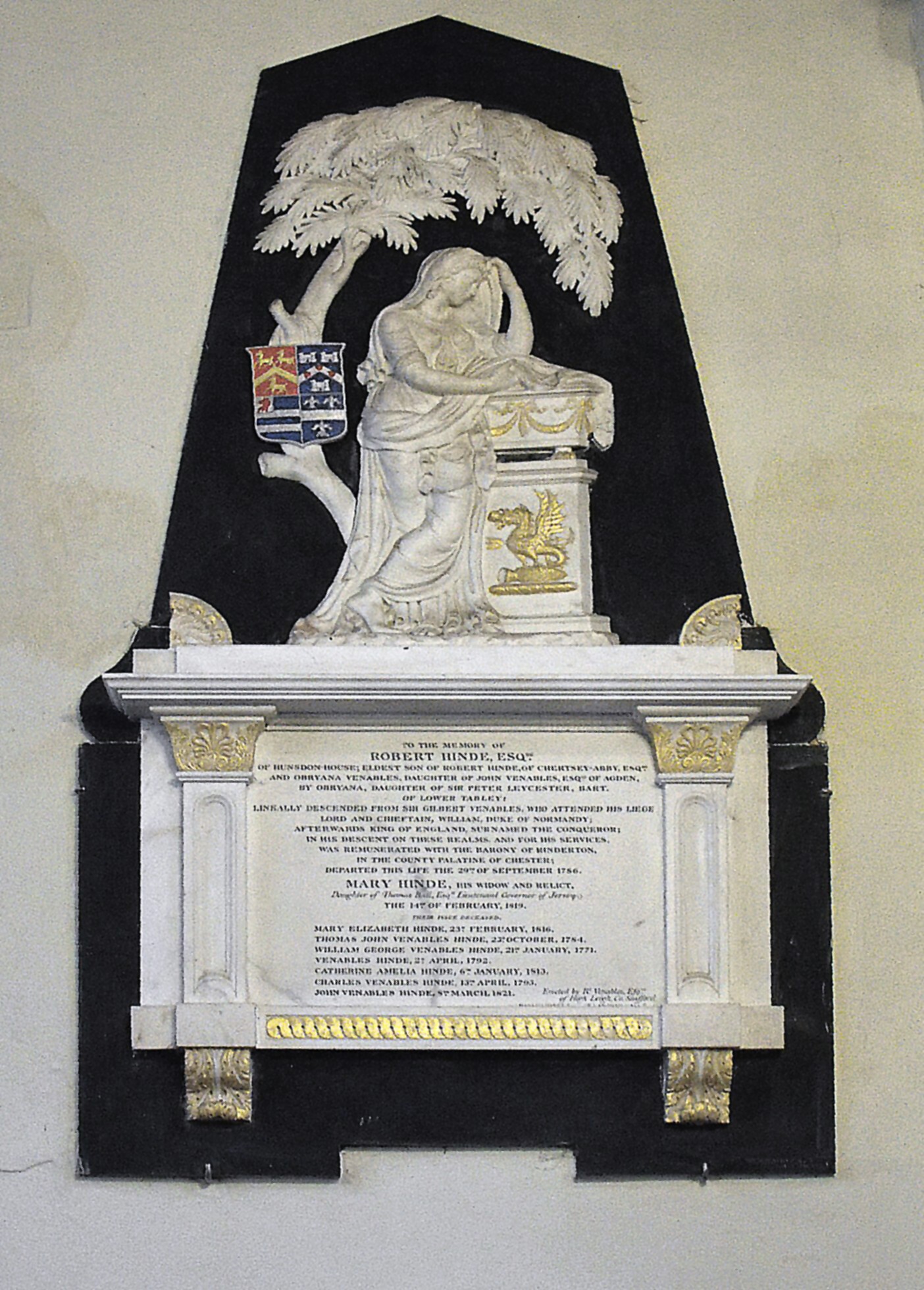 Finally, returning inside the building, other internal work to examine at St. Mary's includes several examples of good mediaeval carpentry, even if the church guide is sometimes inclined to overate it. The best of the roofs is the one that was formerly over the chancel but is now above the eastern half of the N. aisle (as illustrated above left), which appears to be early fourteenth century in date: it is flat and formed of three cusped panels across the width, separated by moulded beams. The best screen is the fifteenth century parclose screen between the S. aisle and S. chapel, with two divisions either side of the central opening, especially attractive tracery arranged in two tiers, and twelve nicely carved angels holding the Instruments of the Passion, lined up along the top rail. As for monuments, none are outstanding, but Rupert Gunnis (Dictionary of British Sculptors, 1660 - 1851, London, The Abbey Library, 1951, pp. 368, 369 & 90) identified one by William Stanton (1639 - 1705), commemorating Ralph Skynner (d. 1697), one by Thomas Staynor (1668 - 1731), dedicated to Sir Ralph Radcliffe (d. 1721), and two by William Chadwick of Pentonville (fl. 1806-26), commemorating Robert Hinde senior (d. 1786) (illustrated above right) and Robert Hinde the Younger (d. 1819). The font is a fifteenth century piece which would have been impressive before it was mutilated.