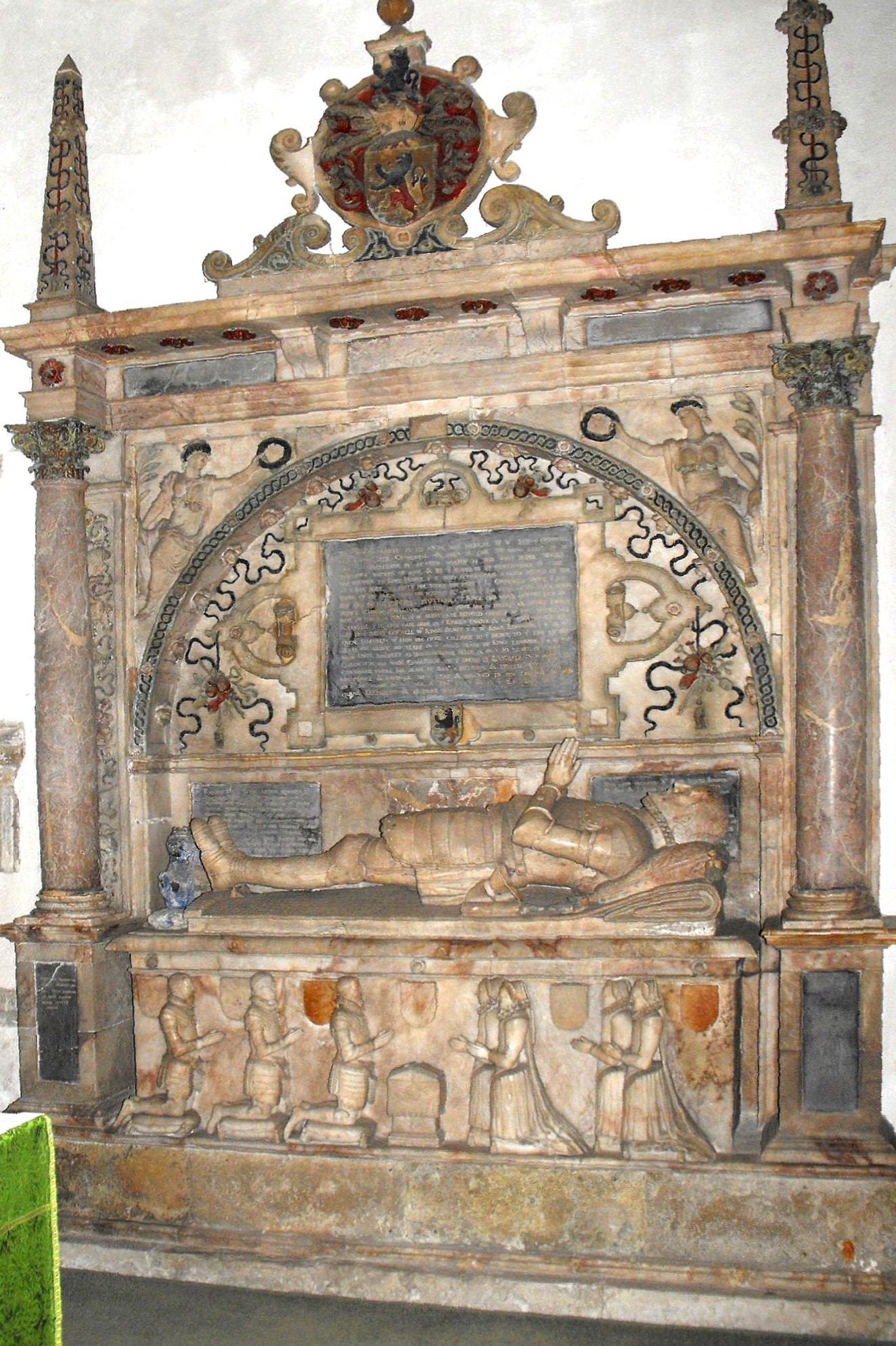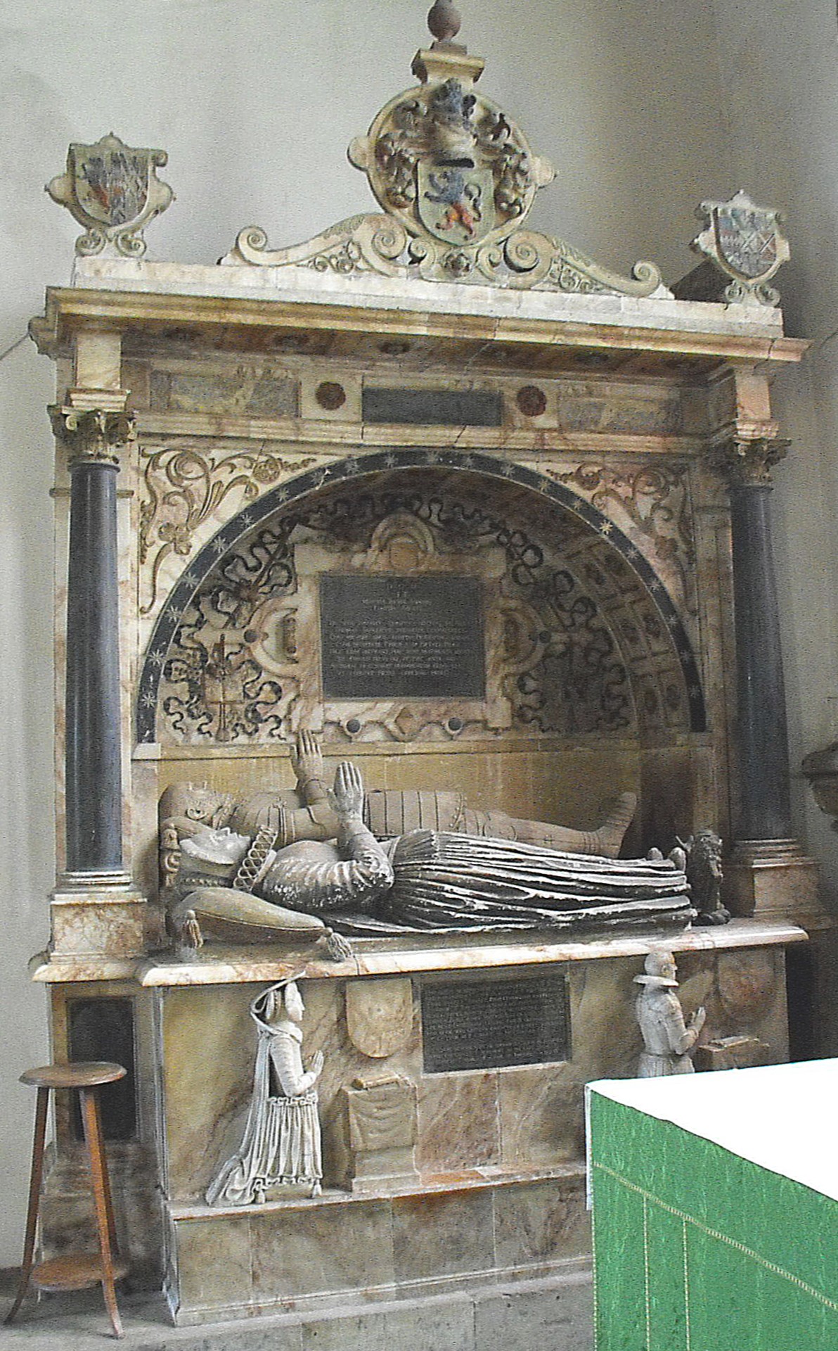 The church contains two prominent monuments worthy of mention which facing each other across the sanctuary. The monument backing against the S. wall commemorates Sir Ralph Sadleir (d. 1587), who was active at the court of Henry VIII (notes in the church) and features an effigy of Sir Ralph beneath a round arch, with semi-classical figures proffering laurel wreaths in the spandrels and brown alabaster side columns supporting an entablature carrying an achievement flanked by obelisks. The profiles of his three sons and four daughters face each other over a prayer desk carved in bas-relief on the tomb-chest. (See the photograph below left.) The monument against the N. wall (shown below right) is dedicated to Sir Thomas Sadleir (d. 1606) and his wife, who are likewise depicted, lying on their backs with their hands clasped above their chests in prayer, this time beneath a coffered arch and with black alabaster columns supporting the entablature. Two fully-carved, miniature supporters - presumably a single surviving son and daughter - kneel at separate prayer desks below.