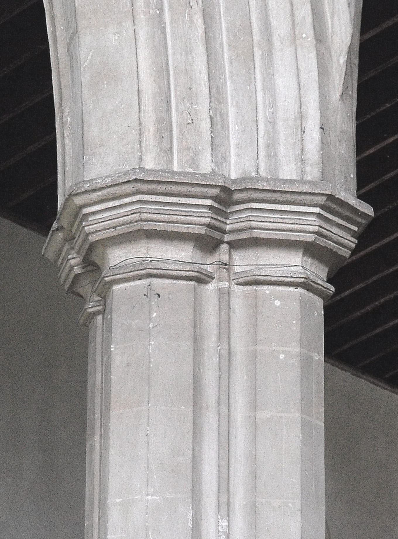 The Perpendicular W. porch is two bays deep (i.e. from east to west) and is lit by two, two-light supermullioned windows on either side, set internally beneath segmental-pointed arches. The very tall outer doorway has a complex profile formed of wave mouldings that die into chamfers running down the jambs. The very large, porch inner doorway carries a series of rolls with fillets, hollows, and little flat chamfers, and has a single order of narrow side-shafts, integral with the jambs. This is presumably early fourteenth century work, like the W. window above, around which the porch was constructed.