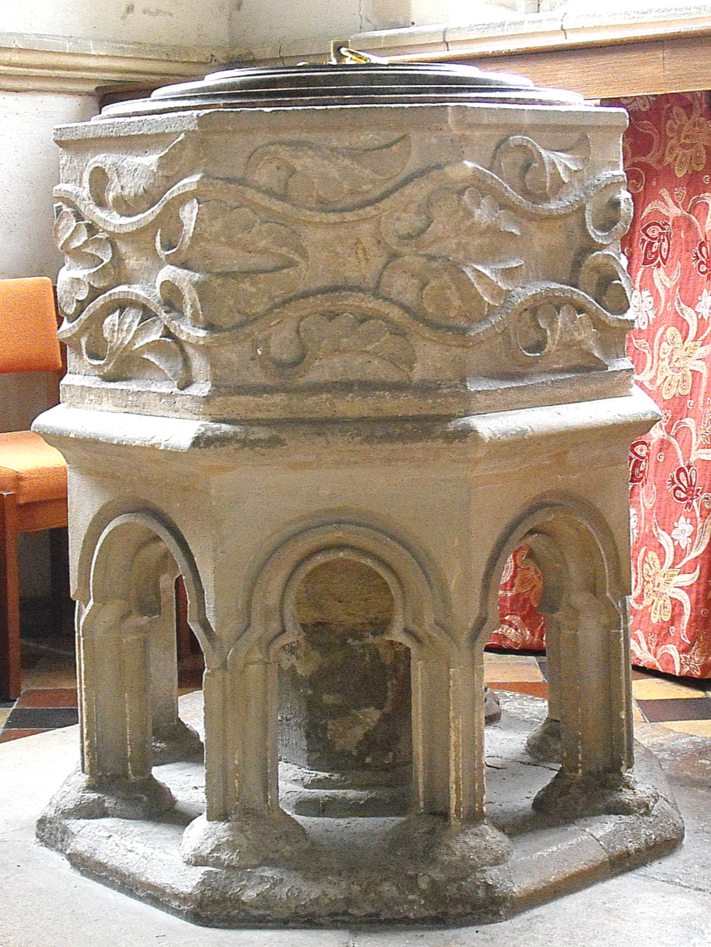 Finally, a note should probably be added on the curious font in the S. aisle (shown below), which seems to defy accurate dating. For Pevsner (Nikolaus Pevsner & Bridget Cherry, The Buildings of England - Hertfordshire, Harmondsworth, Penguin, 1977, p. 340) this was 'a very interesting early C13 design' while the very brief church guide describes it as 'much restored but [partly] of the 12th century', and the britishlistedbuildings web-site, which often copies Pevsner, considers it an 'unusual C13 octagonal font [with a] cusped C19 arcaded base', but no precise date really fits and the visitor must make of it what he or she will.