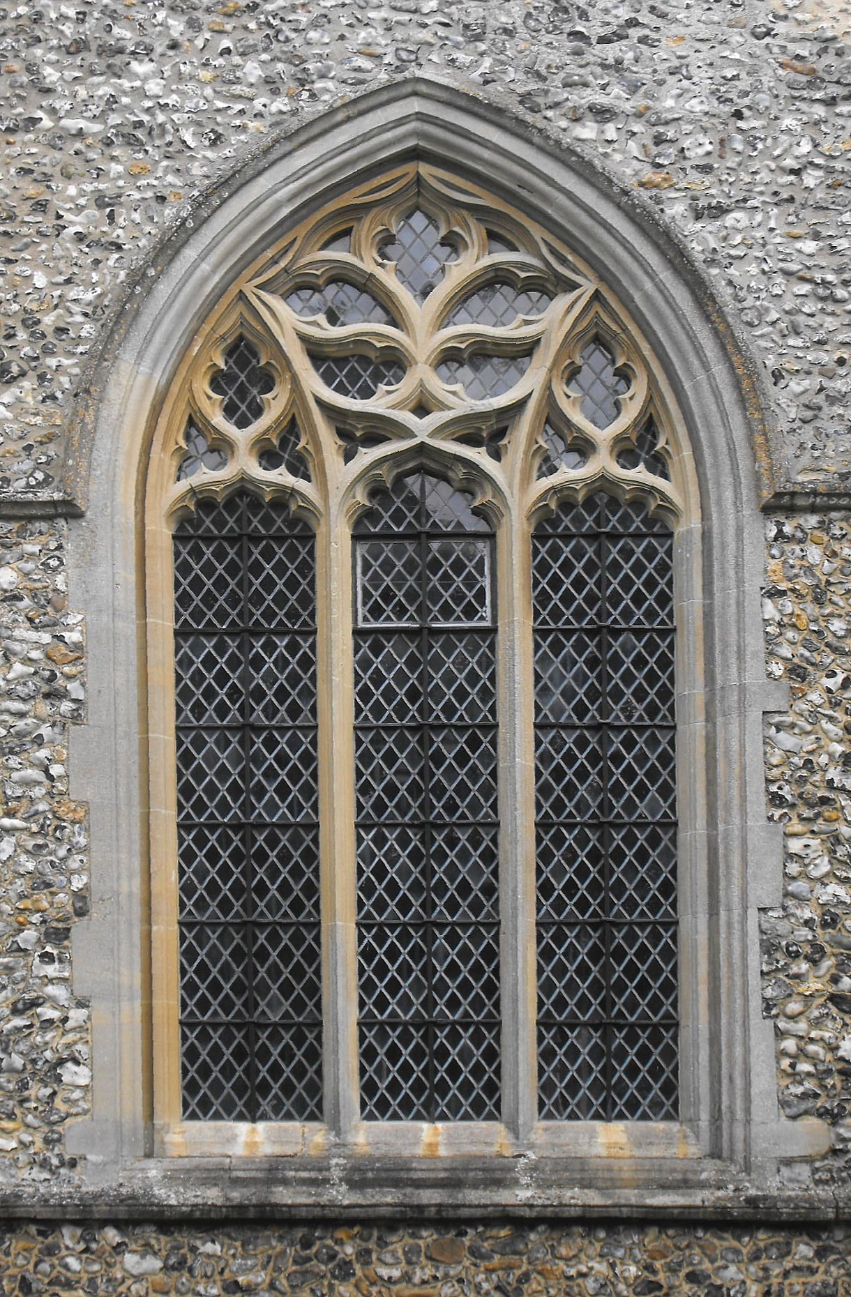 The chancel and perhaps also the tower were originally thirteenth century work. The tower rises in three stages to battlements and a characteristic Hertfordshire spike, buttressed only at its southwest angle with heavy angle buttresses. The two lower stages are constructed of flint rubble and there are little lancet openings in the second, but the bell-stage is rendered and possibly early Perpendicular (i.e. late fourteenth century) to judge by the renewed bell-openings with their straightened reticulated tracery. The large lancets in the chancel are now all Victorian, including the stepped group of three to the east and the equal pair to the north, to the right (west) of the vestry. There is nothing to detain the visitor here, but downslope, the aisled nave is lit by attractive Decorated windows, renewed externally but seemingly original within. They are formed: (a) in the nave W. wall, above the porch, of a four-light window with non-standard flowing tracery; (b) in the N. & S. walls of the aisles, of two-light windows with large reticulation units above the ogee lights (there are four of these on either side, divided in the central bay by a blocked doorway to the north and by a surviving doorway inside a nineteenth century half-timbered porch to the south); (c) in the aisle E. walls, of three-light windows with conventional curvilinear tracery; and (d), in the aisle W. walls, of a compressed variation of the previous design, which looks Victorian on first sight but appears authentic within. (The photograph below right shows the N. aisle E. window and the photograph below left shows the S. aisle W. window.) Perhaps the difference is the result of the engagement of a different mason a couple of decades later. The clerestory consists of two-light windows with quatrefoils above, aligned internally above the arcade spandrels.