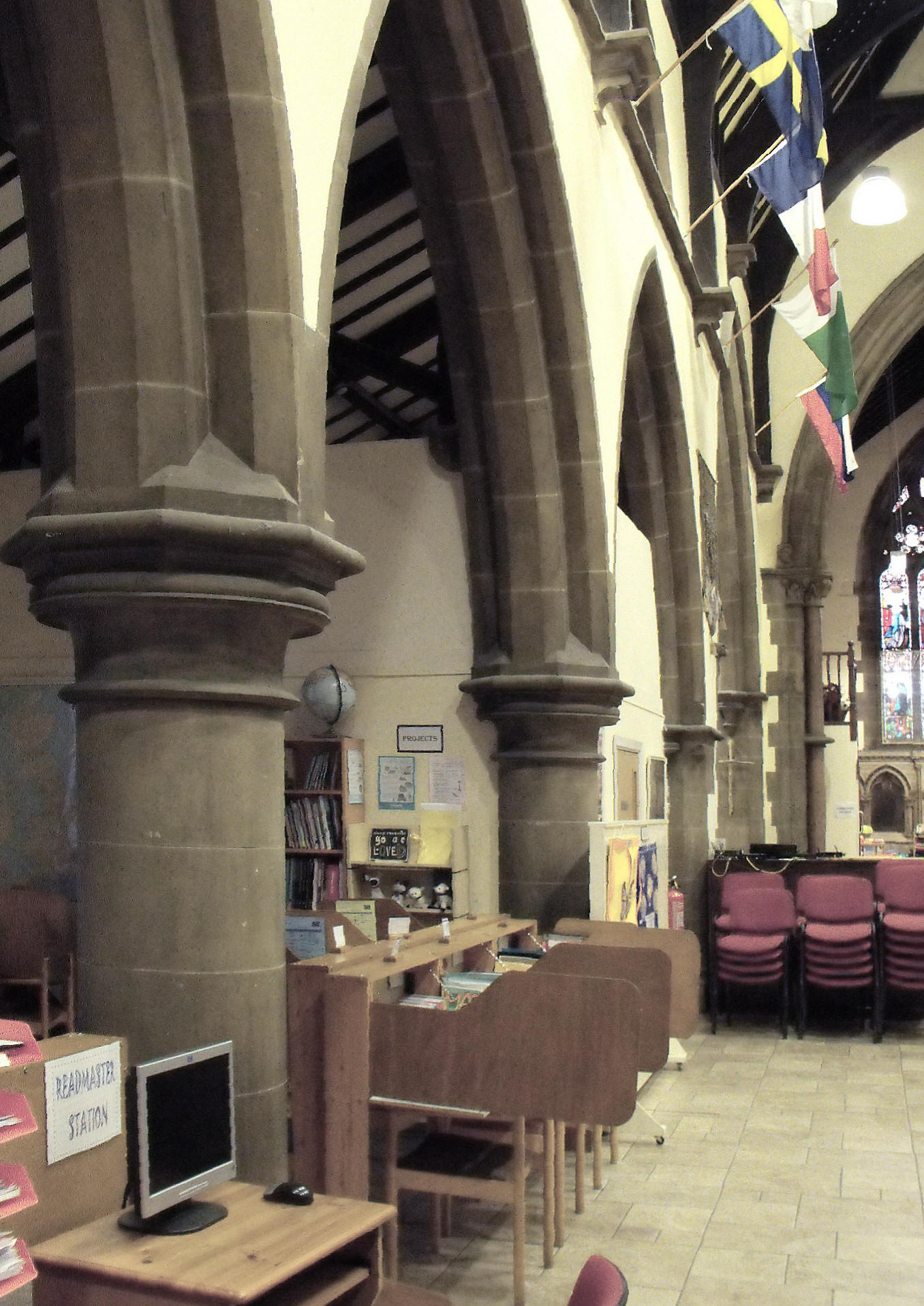 Inside the church, the nave arcades are formed of four double-flat-chamfered arches each side supported on circular piers, while a fifth bay separated by short wall pieces beyond and supported on corbels, leads to the transepts. (See the photograph of the N. arcade, above right.) The tower arch is lancet-pointed and triple-flat-chamfered with the inner chamfer rising from corbel shafts, and the chancel arch carries wave mouldings above an order of marble shafts in shaft-rings, topped by stiff-leaf capitals carved in limestone. The nave roof is of collar-beam construction, with purlins ⅓ and ⅔’s of the way up the pitch, the chancel roof has collars but no purlins, while in the case of the transept roofs the situation is reversed. These features aside, the church now holds nothing of historic interest within, but at least in its new rôle as a gospel centre and evangelical church school, the basic fabric of this fine building seems tolerably secure.