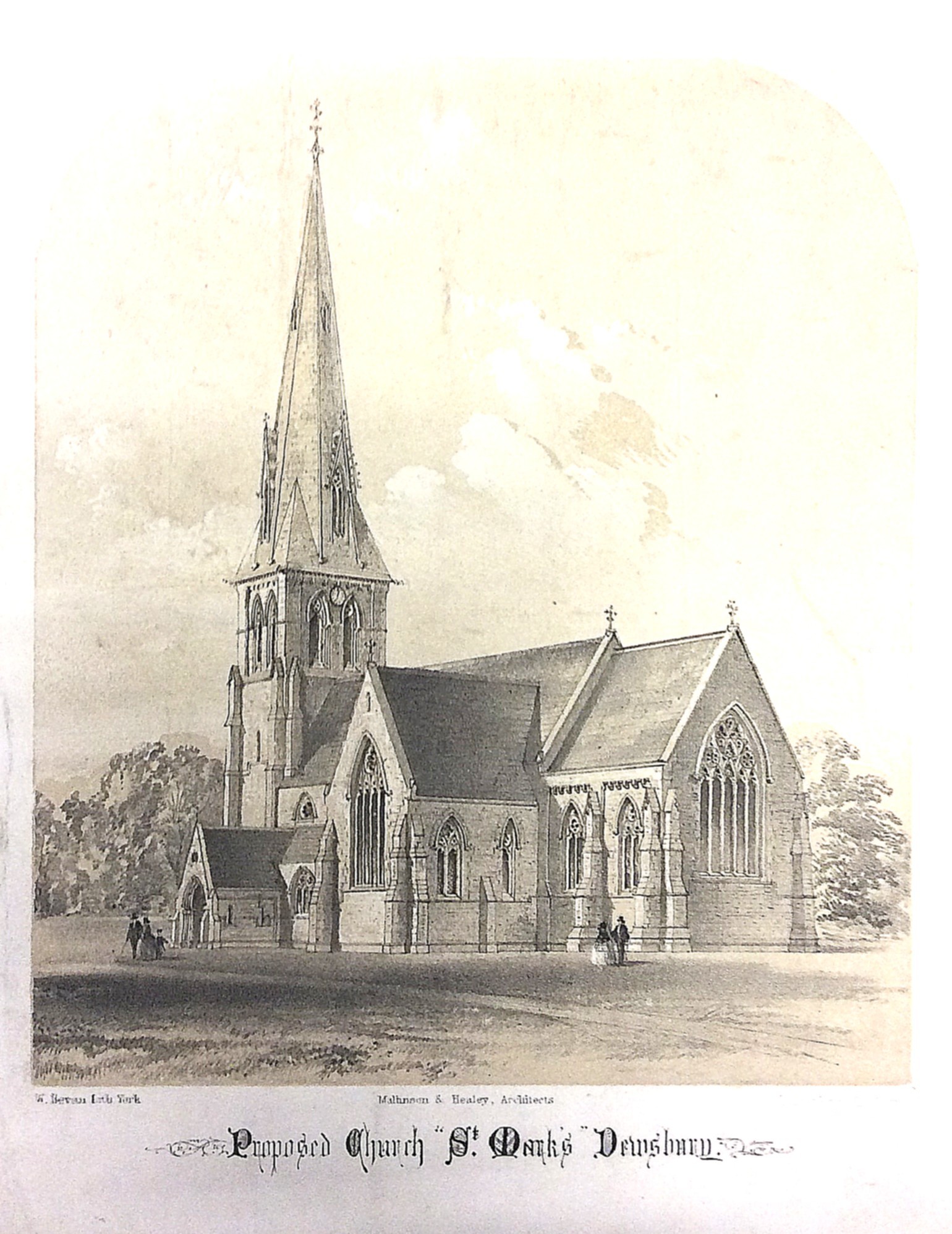 'A city that is set on a hill cannot be hid' (Matt, ch. 5, v. 14), and a notable feature of Mallinson's and Healey's churches was how many were erected in prominent hilltop positions, the best of which enabled them to be silhouetted against the skyline. Two of the very best examples were St. Thomas, Claremount, and All Saints, Salterhebble (both in Calderdale), which even today, after the erection of many more buildings, can be seen a couple of miles away in certain directions at least. The former church of Sty. Mark, Dewsbury, half a mile north of the town centre, has been rather more hemmed in but is still a notable landmark for anyone climbing Halifax Road (formerly Millroyd Lane). (See the photograph above, taken from the east-southeast, and the lithograph of the proposed church before it was built, shown from the southeast, at the foot of the page.) However Thomas Healey probably played only a minimal part in the design of this building as the work seems to have been done principally in the months immediately following his death in November 1862, while the firm continued in business for a short while, with James Mallinson working in collaboration with Healey’s two elder sons, Thomas Henry and Francis. Quite who was responsible for this building, therefore, is difficult to tell, but it is not out of keeping with the firm’s previous productions.